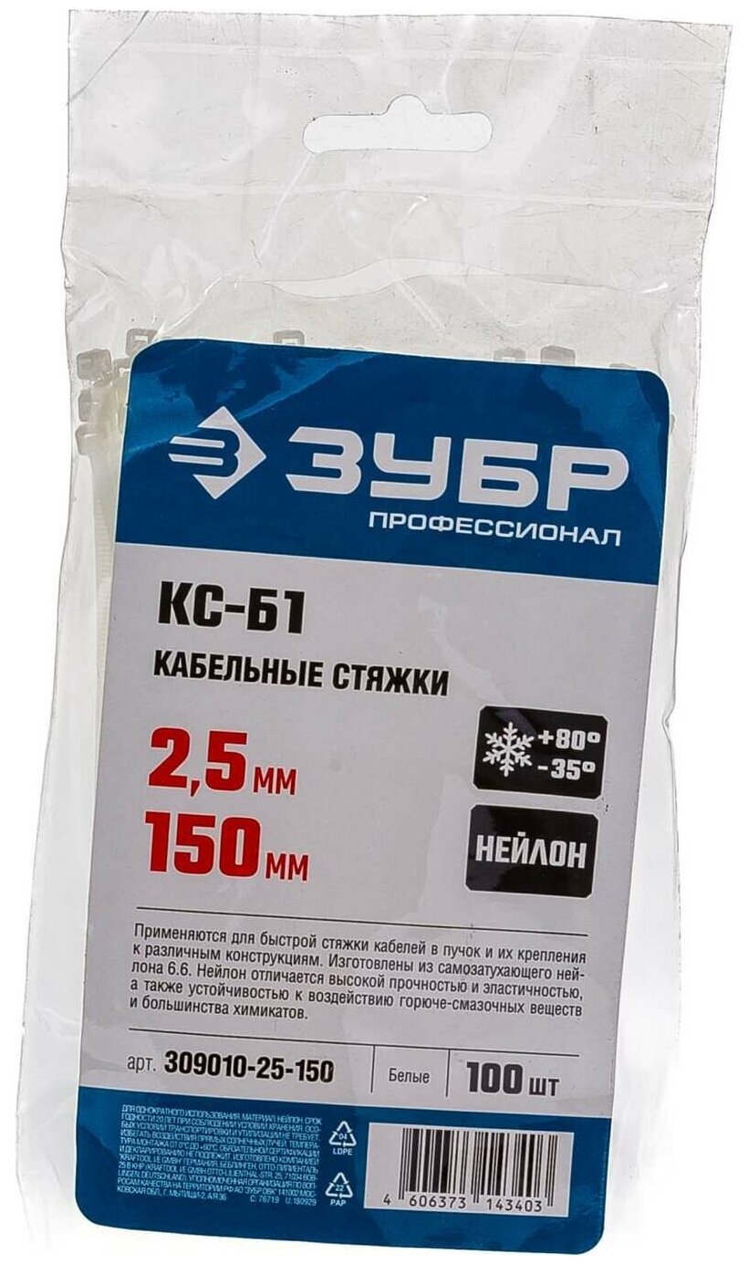 Пластиковые хомуты ЗУБР 309010-25-150, предназначены для быстрой стяжки кабелей электропроводки в пучок и их крепления к различным элементам конструкции при проведении электромонтажных работ. Пластиковые хомуты (стяжки) имеют очень широкий спектр применения при проведении строительных и ремонтных работ. Изготовлены из высококачественного прочного и эластичного нейлона.Преимущества Электроизоляционные (диэлектрические) свойства Повышенная морозоустойчивость и термостойкость Высокая прочность и эластичность Устойчивость к воздействию горючих и смазочных веществ и большинства химикатов Диапазон рабочих температур от -35°С до +80°С допускает использование стяжек в самых разнообразных условиях