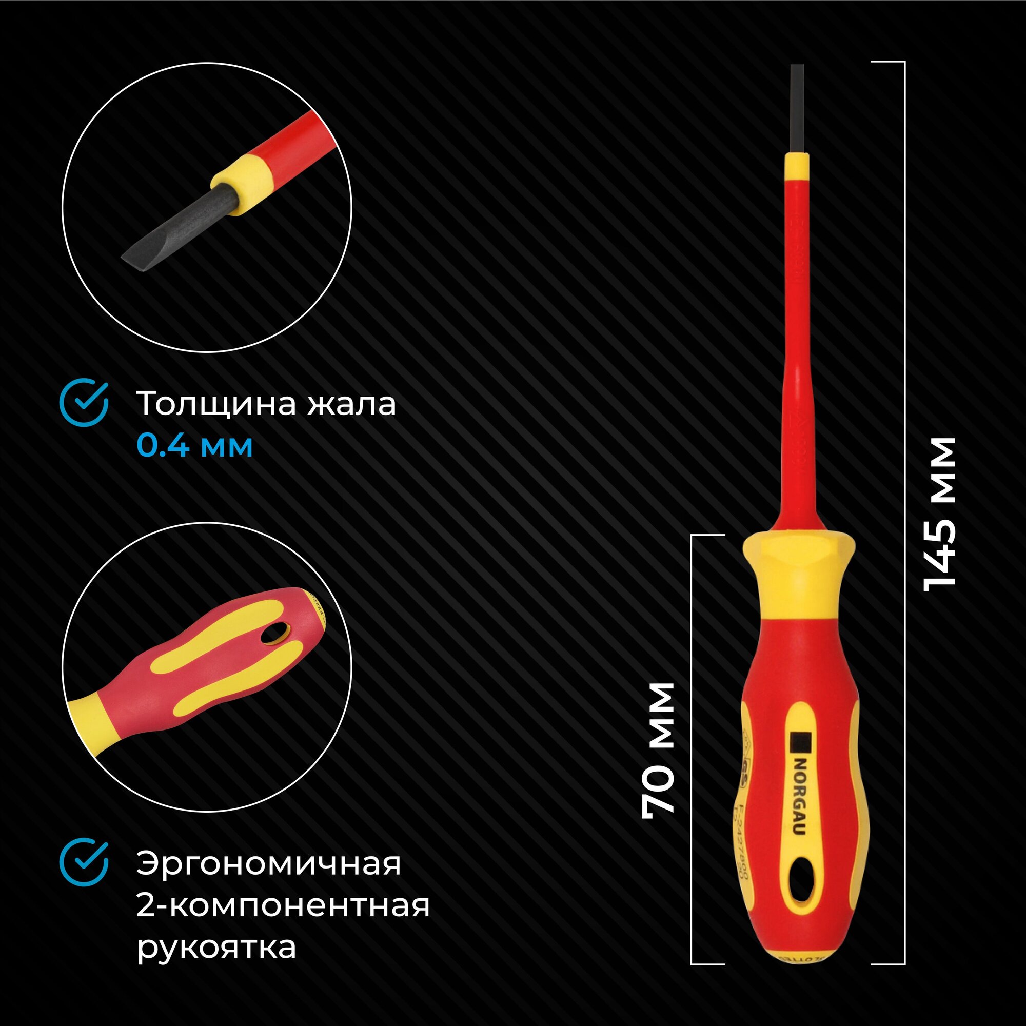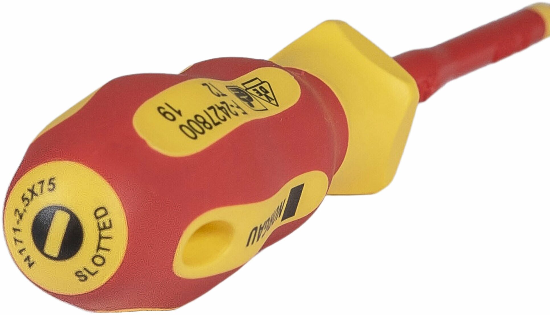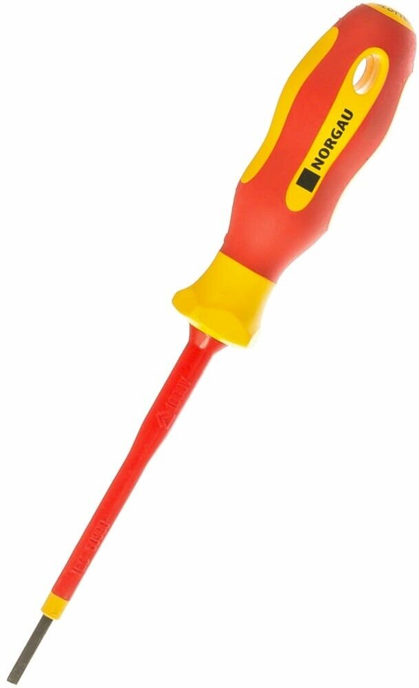 Диэлектрическая шлицевая отвертка NORGAU 2,5x75 предназначена для слесарно-монтажных работ с резьбовыми соединениями с прямым шлицем, которые находятся под напряжением до 1000В. Стальной стержень произведен из новой запатентованной стали SVCM. Диэлектрическое покрытие делает работу безопасной. При обнаружении внутреннего слоя желтого цвета, изделие подлежит обязательной замене. Намагниченное жало позволяет удерживать крепеж во время работы. Фосфатированная поверхность наконечника защищена от коррозии. Эргономичная двухкомпонентная рукоятка не позволяет инструменту выскальзывать из рук. Яркий цвет и маркировка позволяет быстро находить его среди других инструментов. Отвертку можно подвесить на стене для хранения, для этого предусмотрено специальное отверстие на рукоятке. Изделие произведено в соответствии с системой стандартизации DIN ISO 2380.
