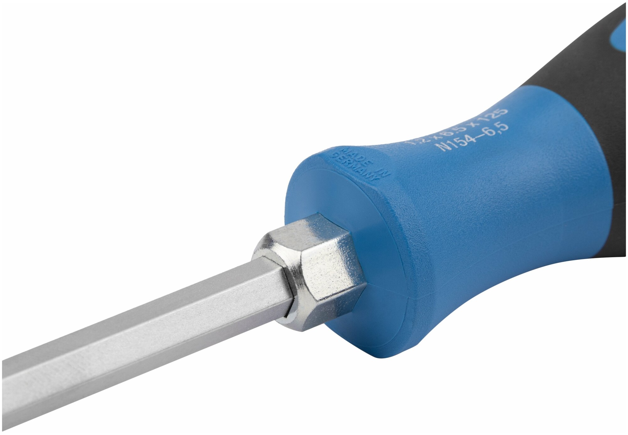 Профессиональная серия инструмента Norgau Industrial Производство Германия Пот прямой шлиц SL Размер шлица- 6,5 мм Длина стержня- 125 мм Длина рукоятки- 101 мм Толщина жала- 1,2 мм Стержень с шестигранником под ключ для увеличения крутящего момента Стержень изготовлен из высококачественной хромованадиевой-молибденовой стали Дополнительное закаливание придает инструменту повышенную прочность и износостойкость Максимально точное соответствие размерам крепежа позволяет достичь оптимальной площади контакта и избежать слизывания граней винта Двухкомпонентная рукоятка обеспечивает защиту от проскальзывания, стойкость к химикатам и большинству растворителей Изготовлено по стандарту DIN ISO 2380