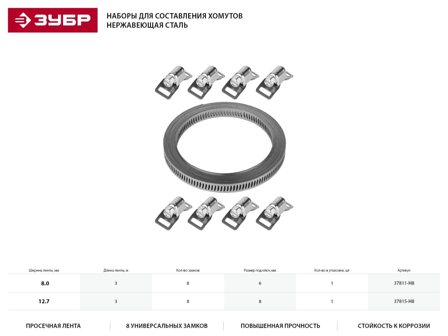 Набор ЗУБР Профессионал Хомут универс. нержавеющий 3мх127мм 8 замков