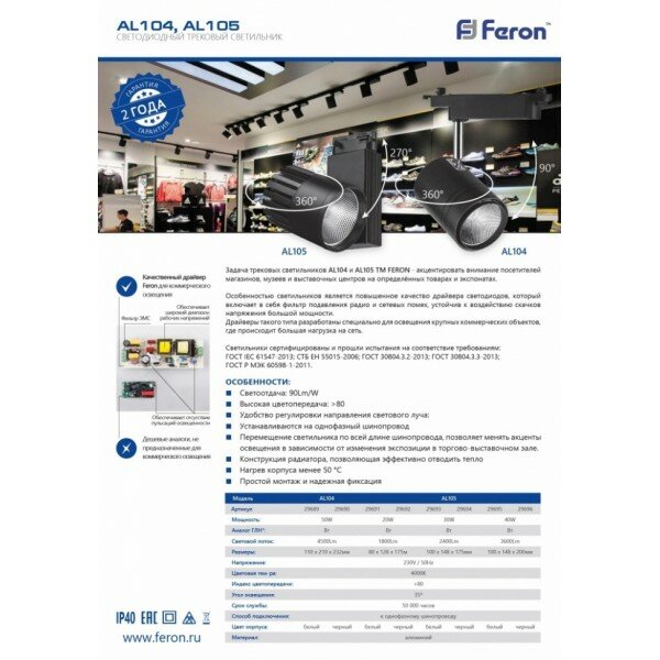 Трековый светильник - продукт известной компании Feron (Китай). Имеет максимальную мощность 50 Вт, освещает площадь до 10 кв. м. Отлично подойдет для таких мест, как гостиная, кафе, кухня, офис, магазин. Впишется в интерьеры следующих стилей: современный.
