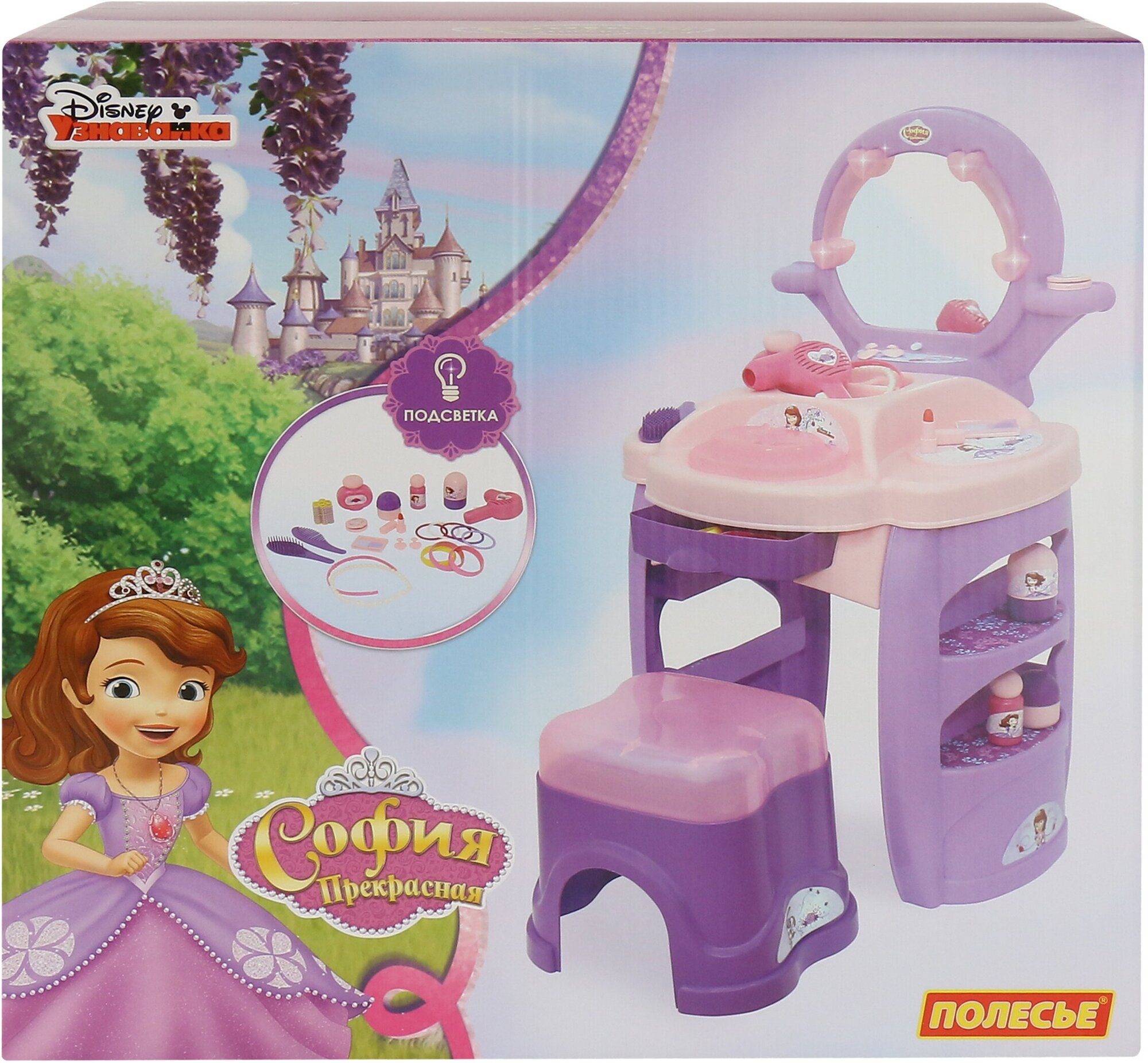 Набор « Салон красоты Disney «София Прекрасная» состоит из столика с зеркалом и стульчика. Зеркало оснащено подсветкой, благодаря которой отлично видно отражение. Парикмахерские принадлежности и украшения удобно хранить в шкатулке и выдвижном ящике столика, а также на специальных полочках.
