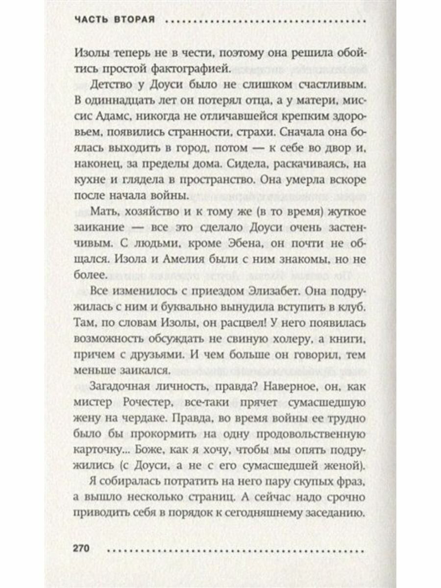 Тот случай, когда эпитеты "тёплая и уютная" не означают "проходная и никчемная". Если определять идеальное время для чтения этой книги, как сейчас это принято, то я посоветовала бы провести с "Клубом" пару хмурых осенних вечеров, сидя под пледом с кружкой горячего чая в руках. Эта история, как уже было верно подмечено, вряд ли поразит вас с первых страниц, но когда вы втянетесь в неё с головой и наконец-то запомните who is who, сюжет её скорее всего вас увлечет и уже не отпустит до самого конца. Если оценивать "Клуб" объективно, то это определенно не лучший представитель своего жанра. К тому же вкрапления о периоде оккупации Нормандских островов воспринимаются четко перпендикулярно основному сюжету про молодую писательницу, внезапно нашедшую друзей, любовь, а заодно и сюжет для книги на острове Гернси. И всё же яркие, колоритные персонажи и их небольшие истории делают эту книгу немножко реальной, как будто вам её рассказывают люди ещё не знакомые, но уже те, с которыми вам очень хочется подружиться. В итоге роман читается легко, увлекательно и приятно. Повторюсь, что для осеннего тихого чтения книга подойдет в самый раз.