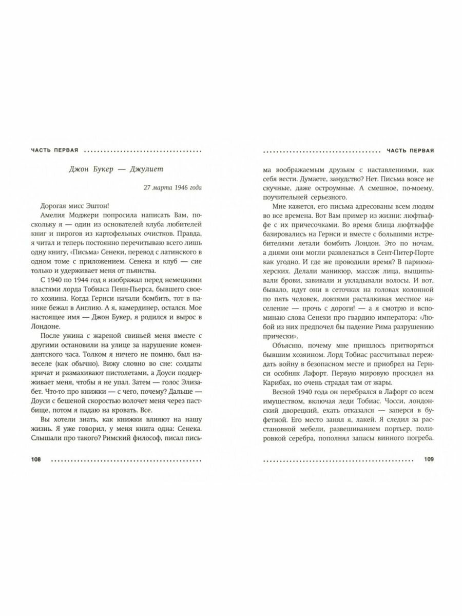 Поначалу стиль написания книги в виде писем немного напугал, так как обычно в книгах, написанных таким образом очень много лишних повествований и высокопарных оборотов, что затрудняет чтение. Но эта книга поражает своей лёгкостью, в каждом письме раскрывается характер персонажа и как будто погружаешься в то голодное и тяжелое время, когда небольшая группа деревенских жителей собиралась в маленькой гостинной и обсуждали прочитанные книги, давясь не очень съедобным пирогом. До сих пор улыбаюсь, вспоминая про этот роман.