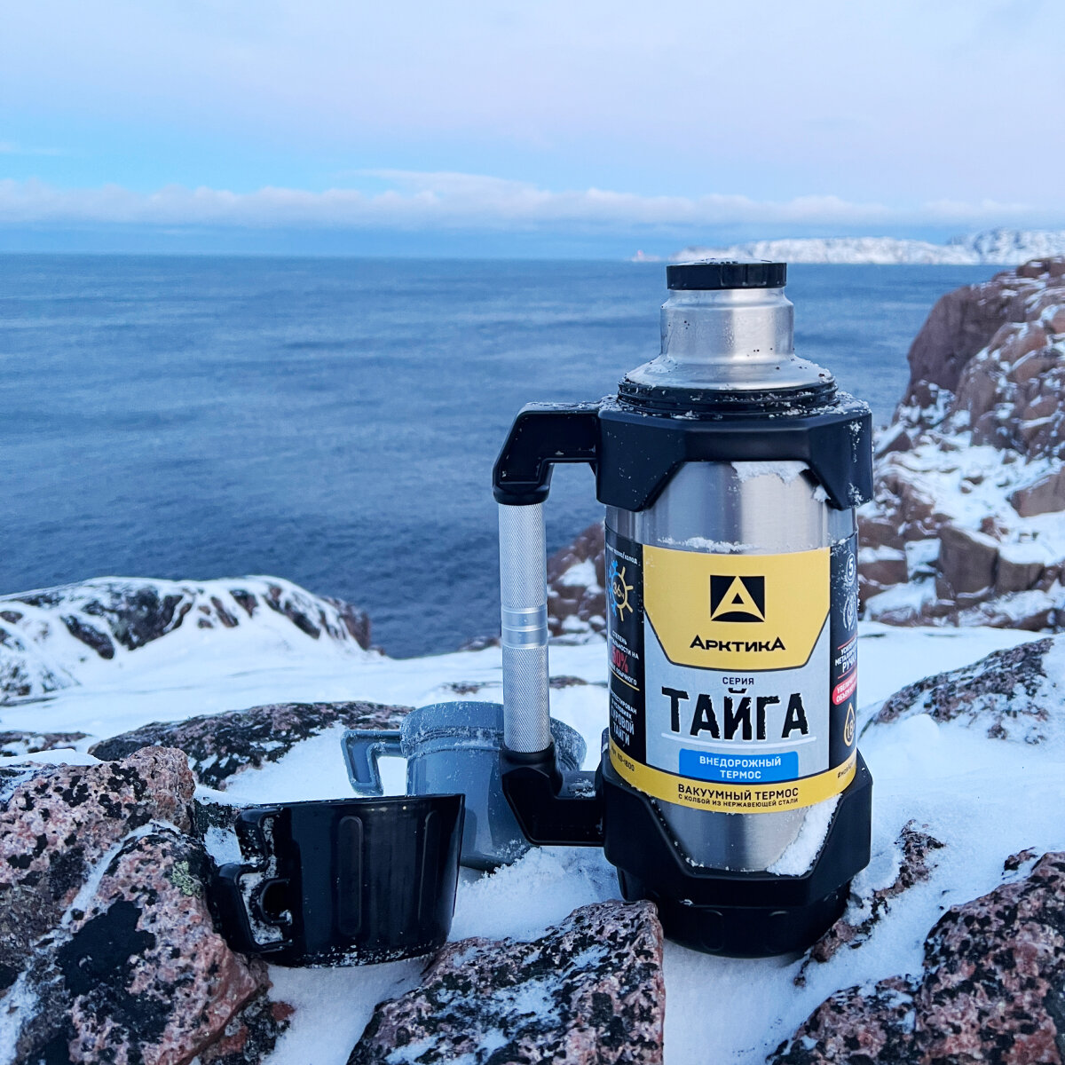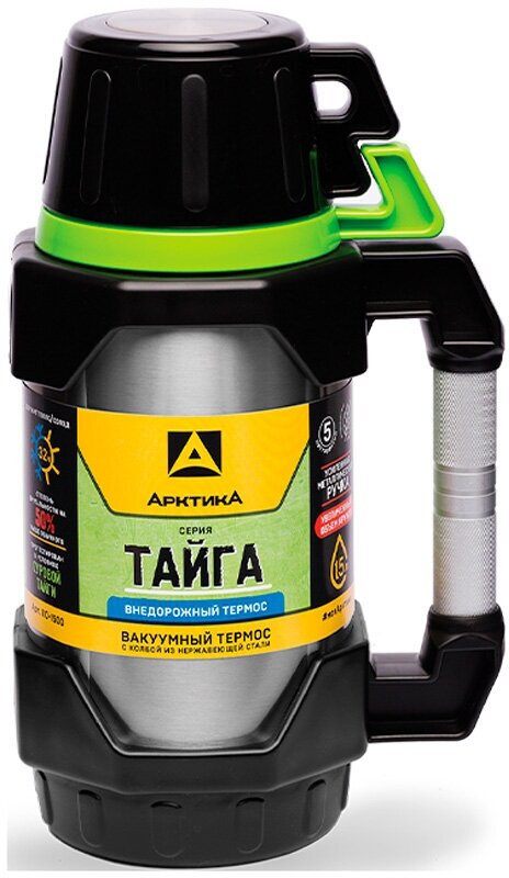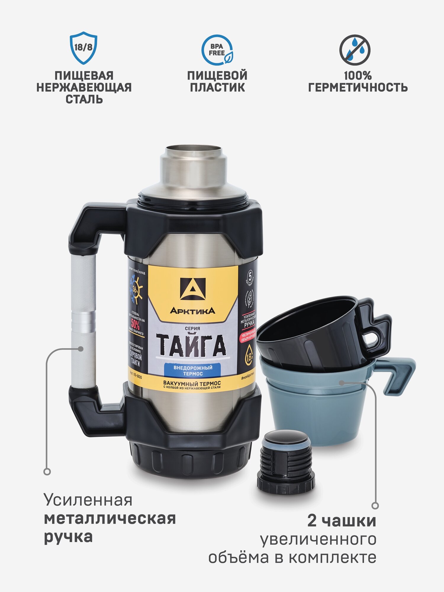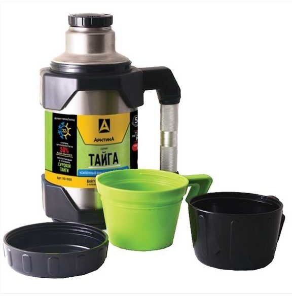 Термос Арктика Тайга (Arctica Taiga) - термос с мужским характером! Он имеет усиленную ручку, сделанную из облегчённого сплава, а корпус термоса защищён пластиковыми деталями, изготовленными из усиленного пластика, который применяют в оборонной промышленности. Термос комплектуется двумя кружками увеличенного объёма, а откручивающееся дно представляет собой дополнительный резервуар, способный разместить в себе разные полезные мелочи.