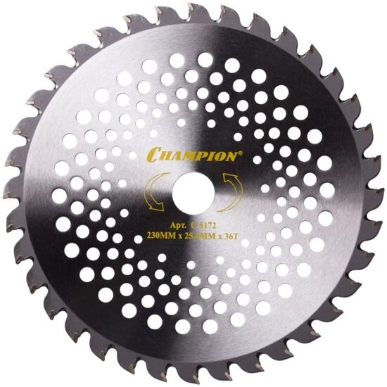 Нож с зубцами из твердого сплава Speed (36 зубьев, 230х25,4 мм) CHAMPION C5172 подходит для работы с профессиональными триммерами SRM-2305SI, SRM-2655SI. Без труда срезает жесткую траву и мелкие кустарники.
