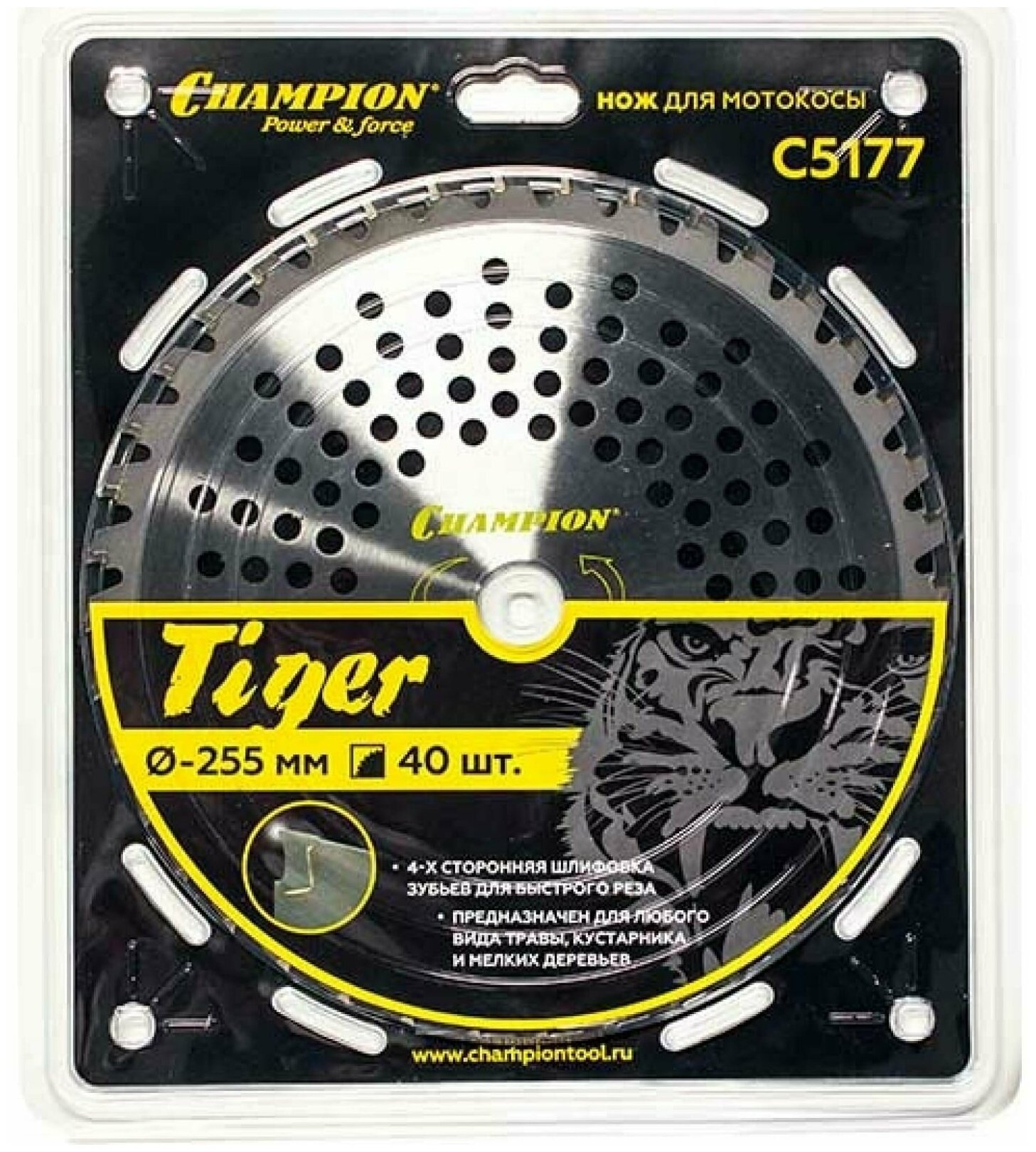 Нож с зубцами из твердого сплава Tiger (40 зубьев, 255х25,4 мм) CHAMPION C5177 подходит для работы с профессиональными триммерами SRM-330ES/SRM-350ES, 4605. Без труда срезает жесткую траву, тонкие деревья и кустарники.