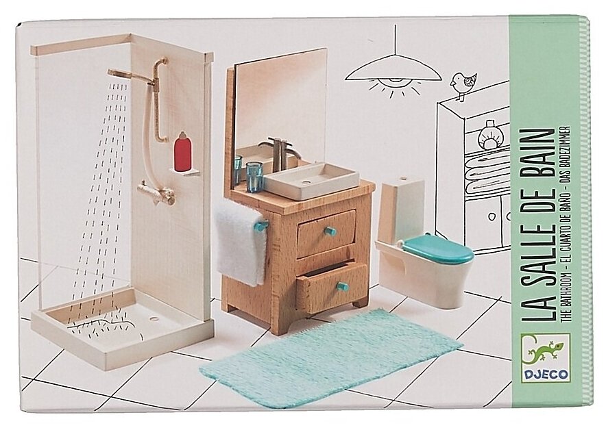 Набор мебели для кукольной ванной комнаты от французского бренда Djeco отличает высокоекачество исполнения и точная детализация интерьера. В комплекте душевая кабина с шампунем наполочке, раковина с безопасным зеркалом и махровым полотенцем, унитаз и коврик на пол. Предметы мебели выполнены из дерева,хлопковой ткани и других безопасных материалов, всепредметы окрашены безопасными красками. Набор послужит прекрасным дополнением к интерьерукукольного дома вашего ребенка.