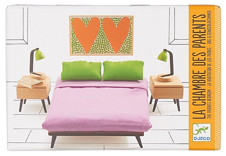 Мебель для кукольного дома Спальня родителей от французского производителя Djeco (Джеко) – превосходный набор для игр, который приведет в восторг всех любителей миниатюрных игровых фигурок и кукольных домиков. В набор входит: - Кровать с матрасом постелью и подушками,- 2 прикроватные тумбочки, - 2 настольные лампы,- Книги, - Картины для стен. Мебель станет прекрасным дополнением для сюжетных игр ребенка.