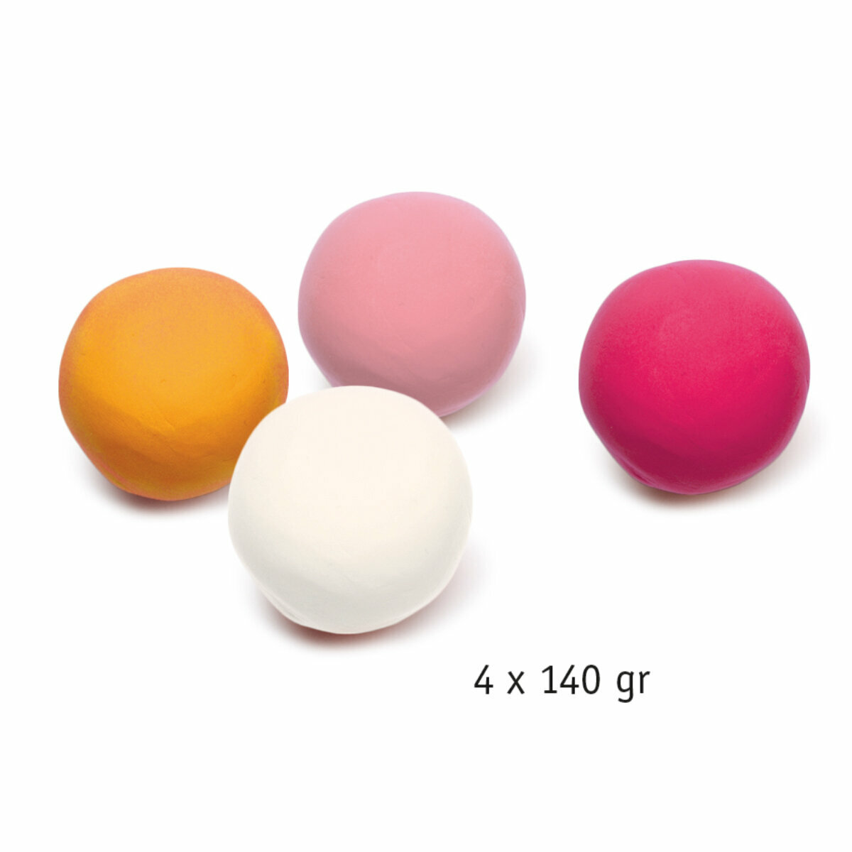 Набор пластилина от известного французского производителя Djeco надолго займет вашего ребенка! Используя мягкий пластилин, ребенок сможет создавать фигурки разных форм и цветов. Набор развивает мелкую моторику рук ребенка, внимание, воображение и цветовосприятие. Мягкий пластилин, входящий в комплект, абсолютно безопасен для детей, он легко принимает любую форму и не липнет к рукам. В набор входит: 4 баночки с мягким пластилином пастельных цветов: оранжевый, фуксия, розовый и белый.Вес одной баночки 140 г.