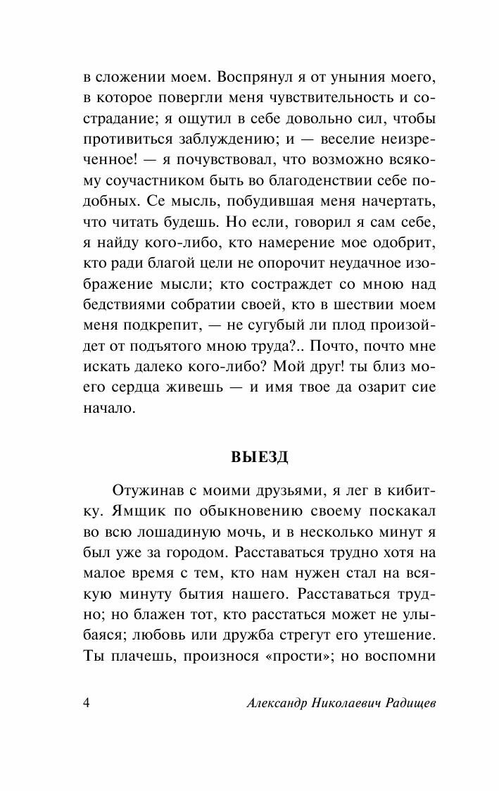 Перед прочтением книги, нельзя не сказать немного о истории книги- конец 18 века. Радищев напечатал небольшой тираж на собственной маленькой типографии(книга прошла цензуру). Около 100 книг разошлись моментально по знакомым и весь Петербург загудел. Радищев испугался, не ожидая такой бурной реакции,и сжёг оставшиеся экземпляры. Узнав о книге Екатерина 2, приговоривает автора к смертной казне. Впоследствие, поняв, что Радищев не является угрозой, заменила ее 6 годами ссылки. От первоначального тиража, остались несколько экземпляров: в тайной полиции, у Пушкина и ещё около 10. Разрешили книгу в печать только после революции.