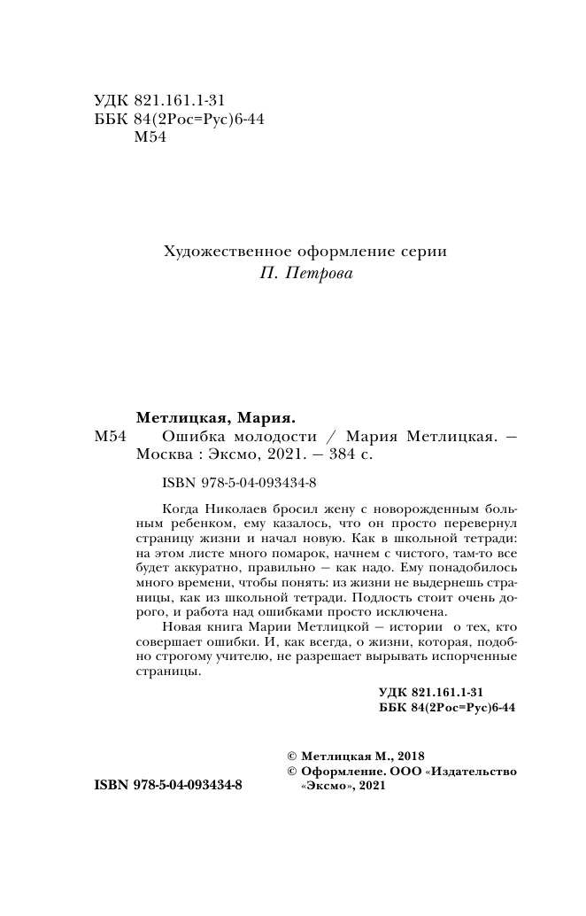 Книга: Ошибка молодости (Метлицкая Мария Робертовна); Эксмо, 2022