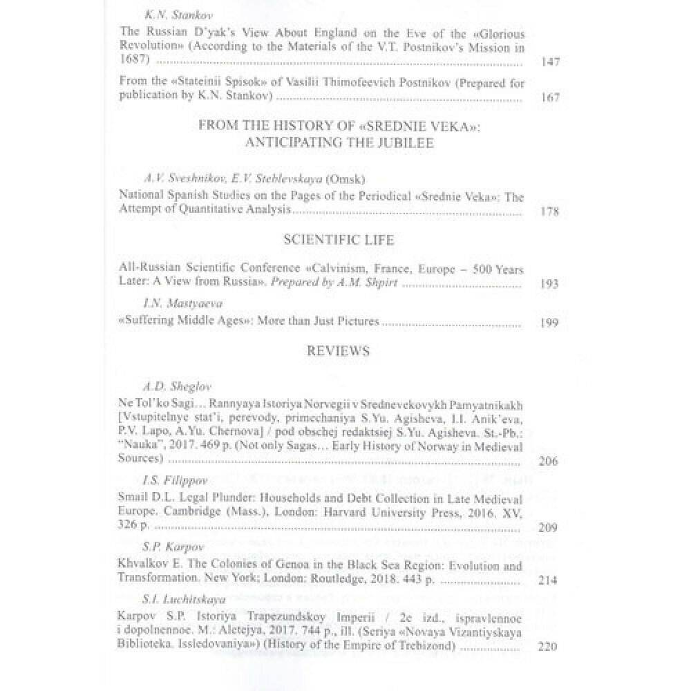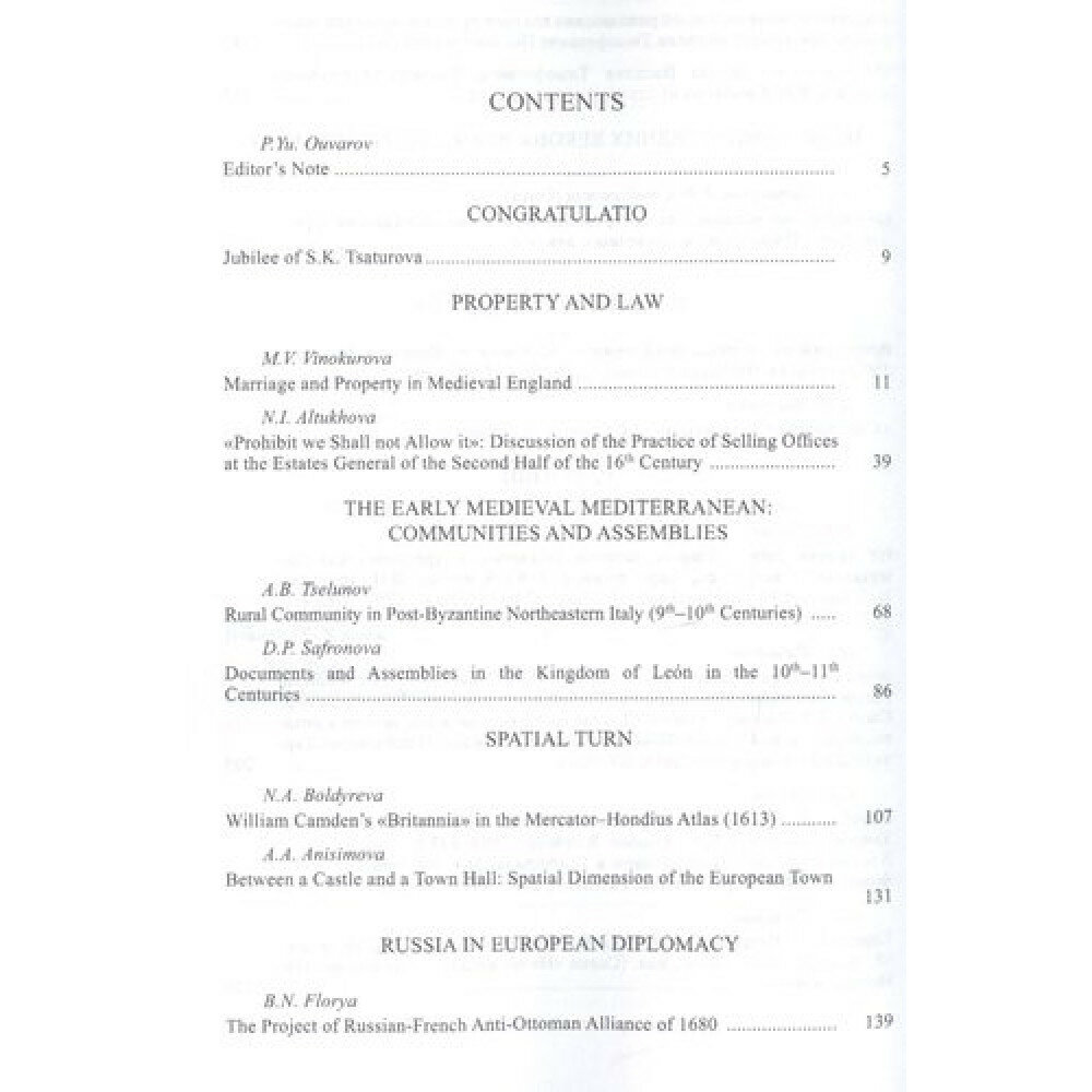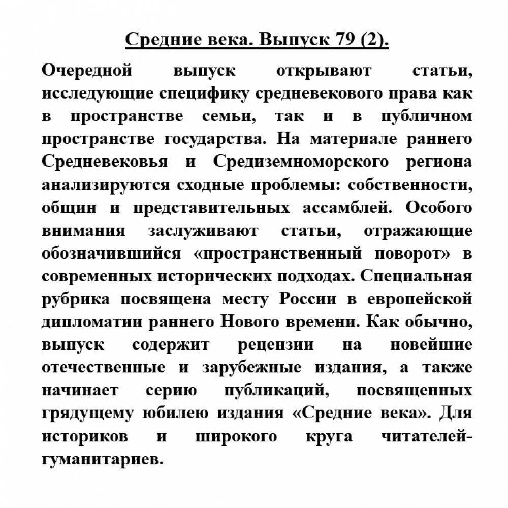 Очередной выпуск открывают статьи, исследующие специфику средневекового права как в пространстве семьи, так и в публичном пространстве государства. На материале раннего Средневековья и Средиземноморского региона анализируются сходные проблемы: собственности, общин и представительных ассамблей. Особого внимания заслуживают статьи, отражающие обозначившийся "пространственный поворот" в современных исторических подходах. Специальная рубрика посвящена месту России в европейской дипломатии раннего Нового времени. Как обычно, выпуск содержит рецензии на новейшие отечественные и зарубежные издания, а также начинает серию публикаций, посвященных грядущему юбилею издания "Средние века".