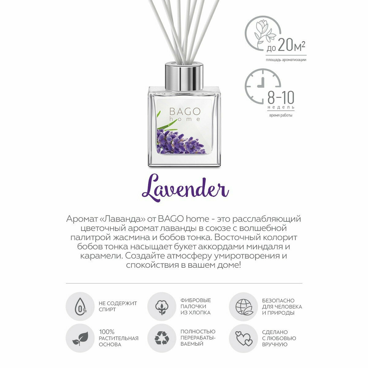 Ароматический диффузор Лаванда от BAGO home - это расслабляющий цветочный аромат лаванды в союзе с волшебной палитрой жасмина и бобов тонка. Восточный колорит бобов тонка насыщает букет аккордами миндаля и карамели. Создайте атмосферу умиротворения и спокойствия в вашем доме!