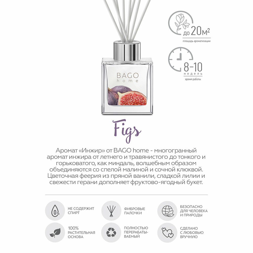 Ароматический диффузор Инжир от BAGO home - многогранный аромат инжира от летнего и травянистого до тонкого и горьковатого, как миндаль, волшебным образом объединяются со спелой малиной и сочной клюквой. Цветочная феерия из пряной ванили, сладкой лилии и свежести герани дополняет фруктово-ягодный букет. Впустите это богатство в дом и удивите друзей!