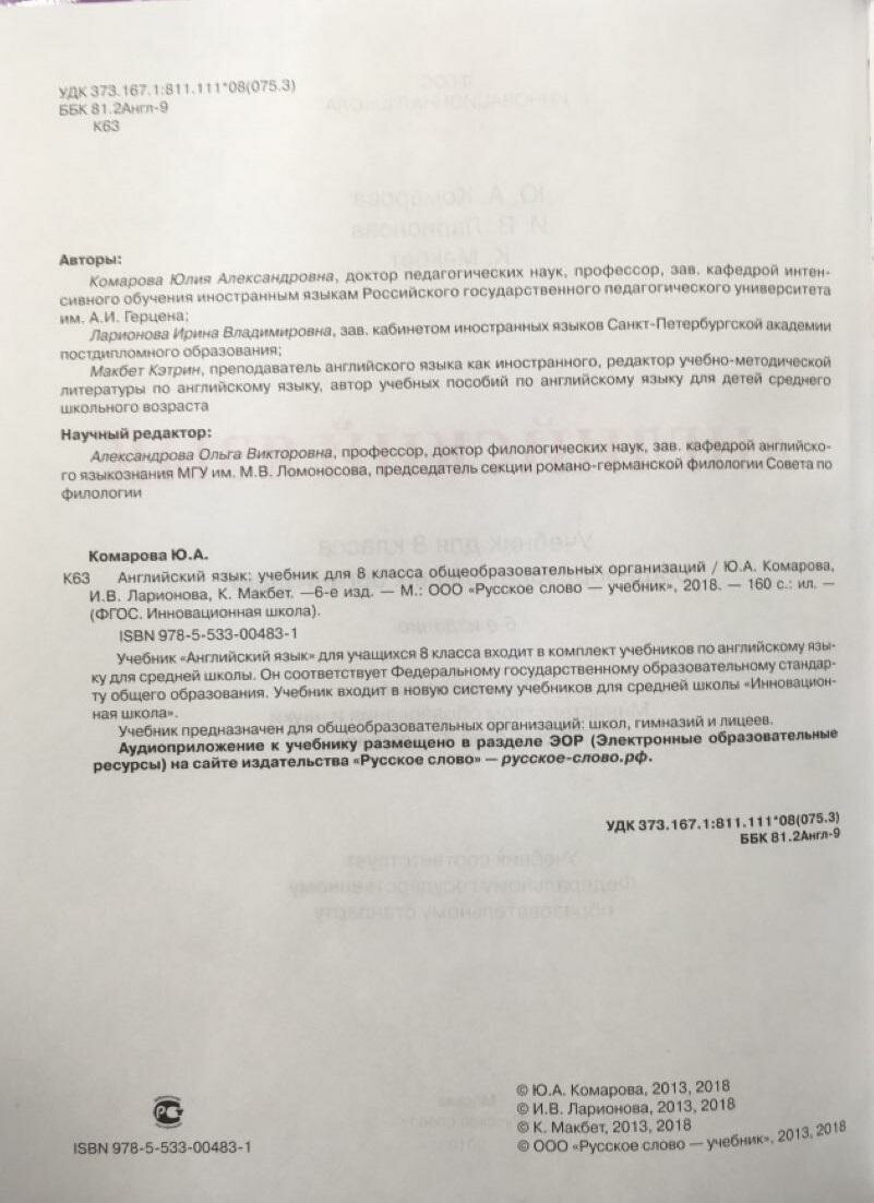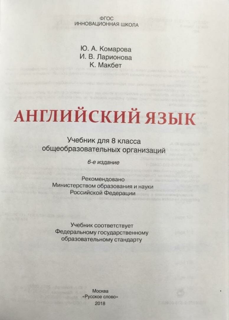 Английский язык: учебник для 8 класса общеобразовательных организаций. . 6-е изд. (Макбет Кэтрин, Комарова Юлия Александровна, Ларионова Ирина Владимировна); Русское слово, 2018