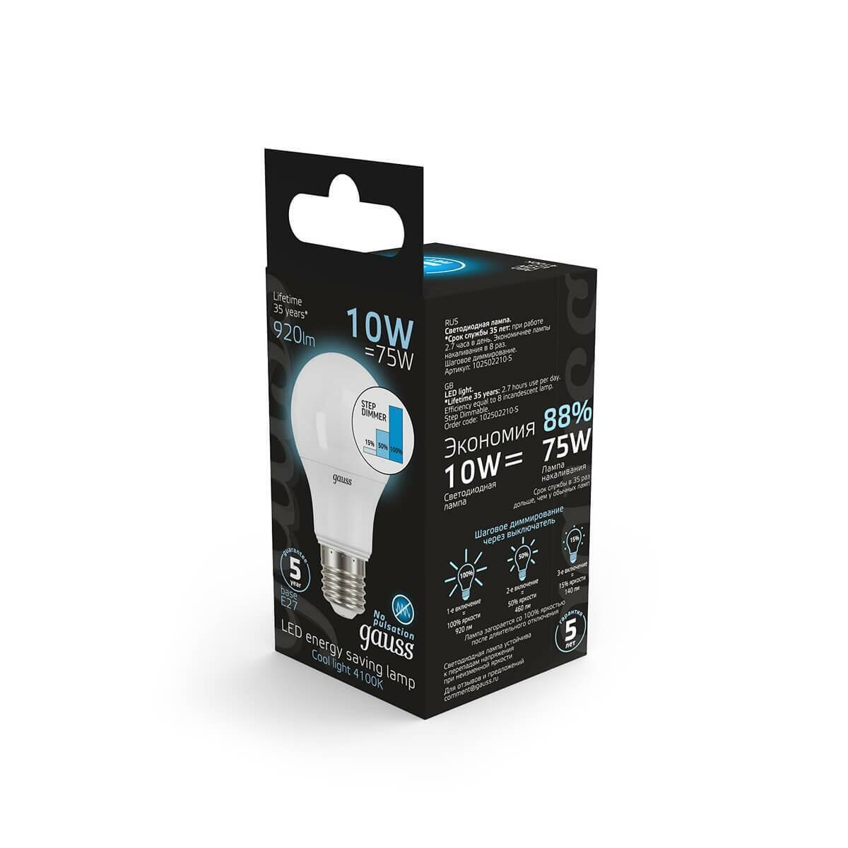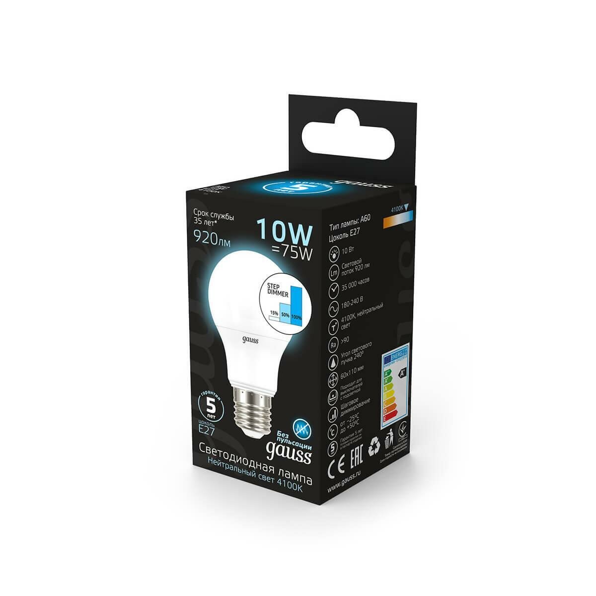 Оптимальное соотношение долговечности, надежности светодиодов и возможность работать в непрерывном режиме делает лампу Gauss выбором для магазинов и офисов. Цветовая температура луча составляет 4100К — приятный мягкий и теплый свет, который комфортен для глаз и слегка рассеян с помощью матовой колбы.