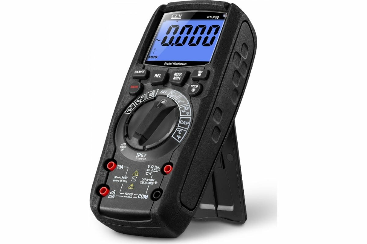 Прорезиненный ударопрочный корпус обеспечивает защиту прибора от различных механических повреждений. Ударопрочная защищенная конструкция позволяет прибору работать в жестких условиях эксплуатации. Эргономичный и современный дизайн имеет подставку-упор для удобного вертикального расположения.Автоматическое включение подсветки дисплея и кнопок в темноте. Яркий светодиодный фонарик.Защита входа: 1000В АС rms или 1000В DC.Входной импеданс: 10МОм.Частотный диапазон переменного напряжения: 50 до 1000Гц.Функция TrueRMS.