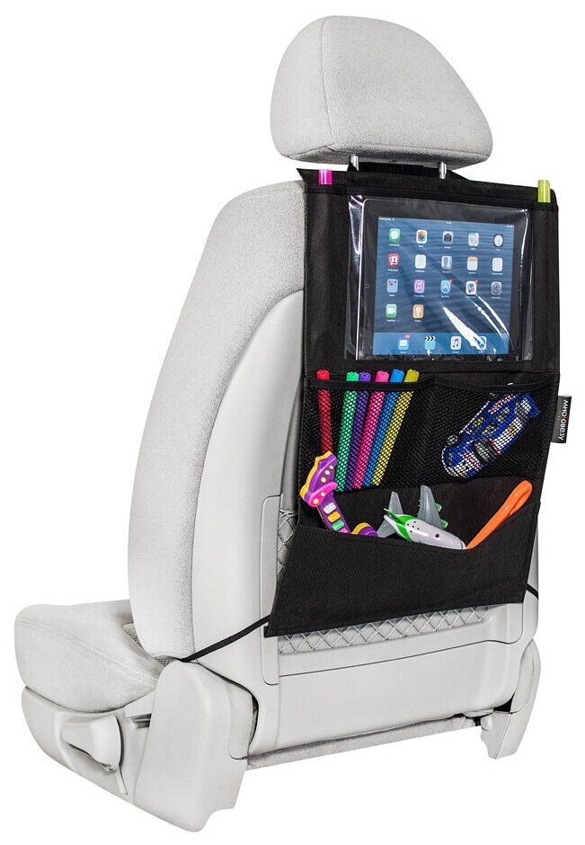 Большое количество карманов, вместит в себя много нужных в дороге вещей и защитит обивку сидений. Отделение для планшета сделано из специальной пленки и позволяет управлять гаджетом не вынимая его. Жесткий верхний каркас не дает верхним углам опустится в низ. Размеры: ширина — 37 см, высота — 52 см. Материал: спанбонд 100 гр/м2, прочная сетка.