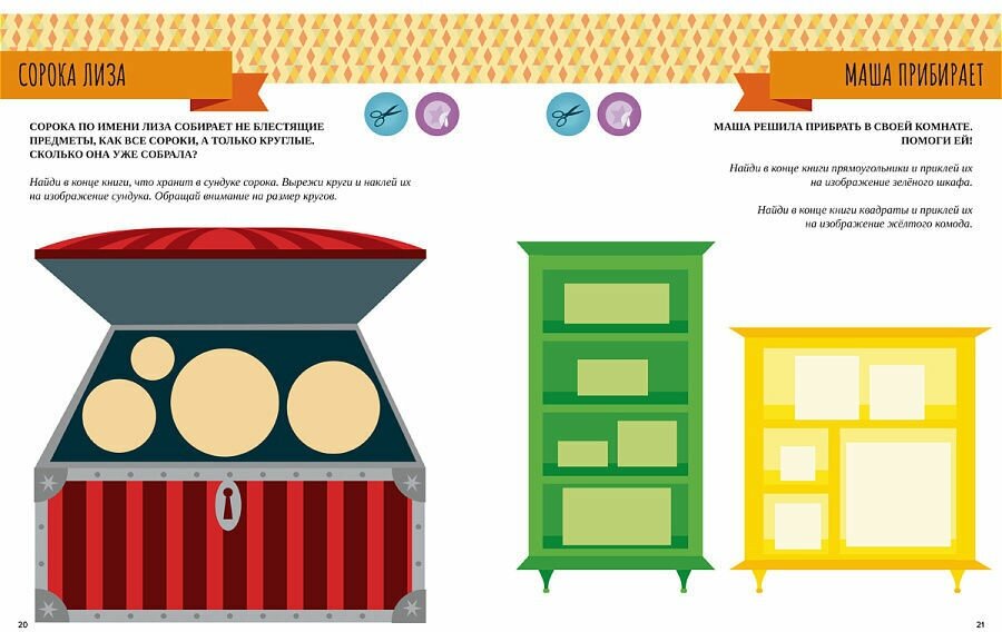 .Малыш будет учиться вырезать детали и там, где требуется, наклеивать их на страницу, самостоятельно решая предложенные задачи.
