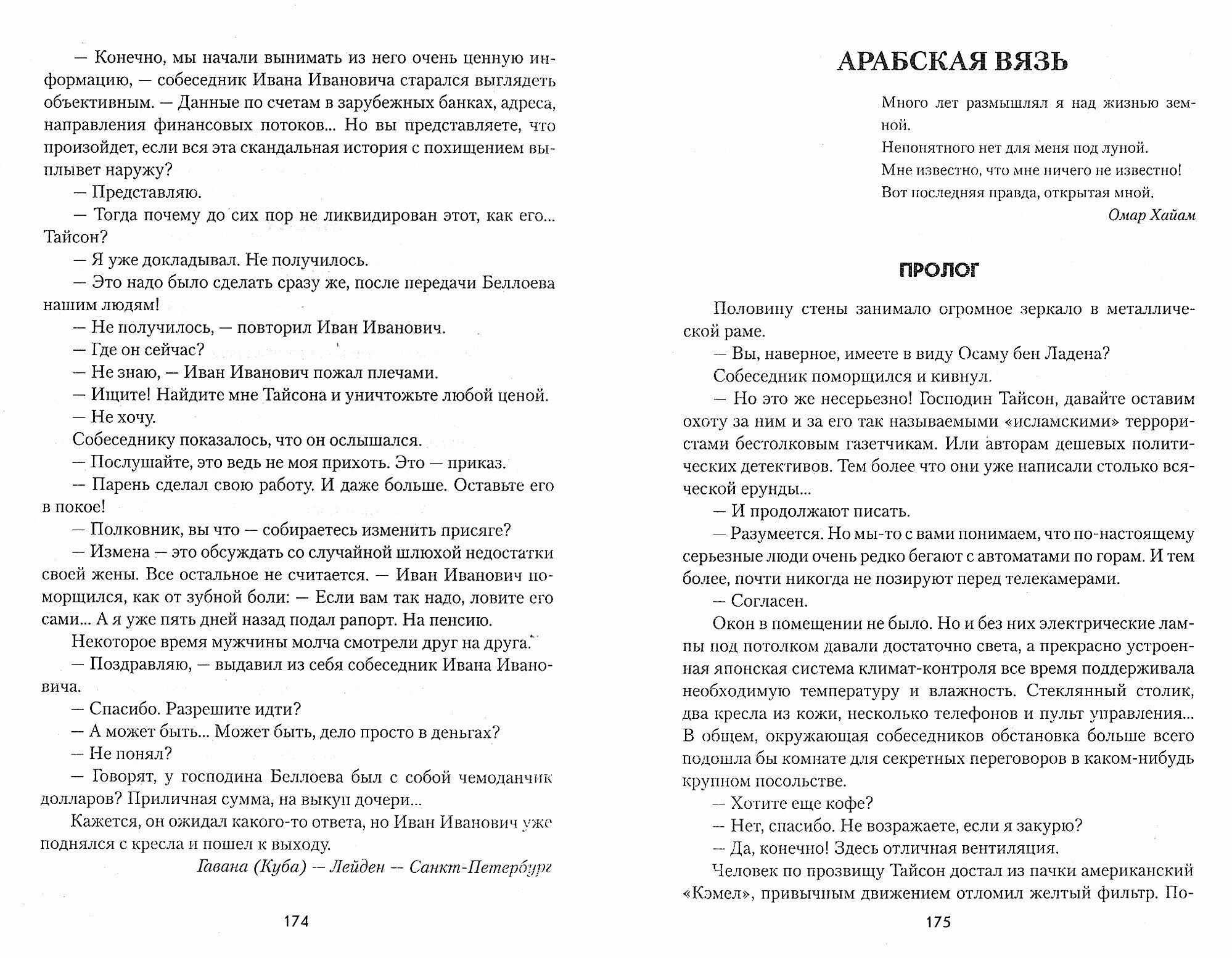 В романе «Арабская вязь» тайный агент российской разведки Тайсон по заданию руководства сотрудничает с ЦРУ и ФБР. Его цель — выявление лагерей арабских террористов, использующих новейшие психотронные технологии для подготовки «шахидов»-смертников. Полем битвы разведчика становятся Западная Германия, США, Египет, Центральная Россия и Закавказье.