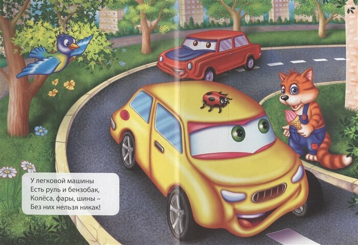 Детская книжка из плотного картона.Странички закруглены,подойдёт для самых маленьких.Книжка очень яркая,иллюстрации на весь разворот.Художник нарисовал весь транспорт очень красиво и красочно это сразу привлекает внимание ребенка.На каждом развороте всего одно четверостишие это единственный минус.Сами стихотворения с хорошей рифмой