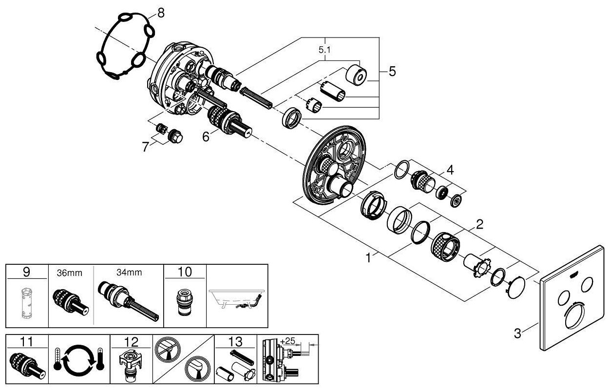 | Технологии | GROHE FastFixation, GROHE Long-Life Finish, GROHE ProGrip, GROHE SafeStop, GROHE SafeStop Plus, GROHE SmartControl, GROHE TurboStat, GROHE Water Saving, GROHE EasyLogic |
