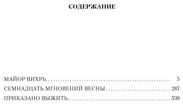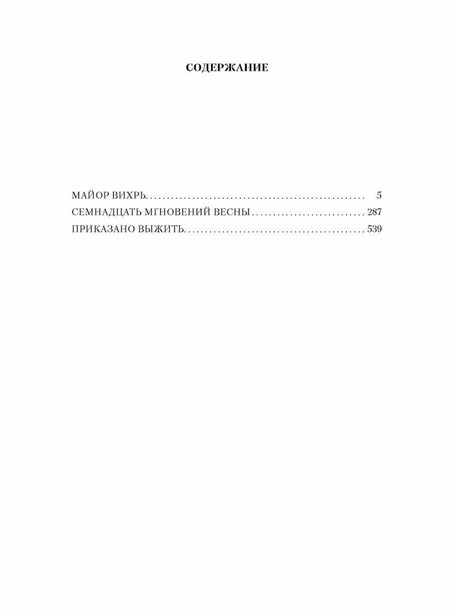 В книгу вошли три знаменитых романа Юлиана Семенова из цикла о Штирлице: «Майор Вихрь» (1967), «Семнадцать мгновений весны» (1969) и «Приказано выжить» (1982).