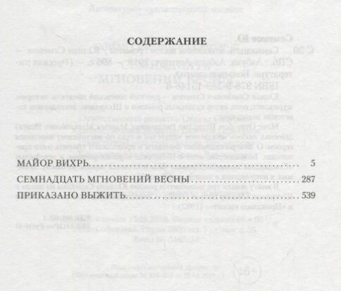 Покупал эту книгу не только из-за «Семнадцати мгновений весны» Юлиана Семенова, которую читал и много раз смотрел. Меня привлекло, что в это издание вошли еще два произведения, хронологически обрамляющие «Семнадцать мгновений». Это «Майор Вихрь» и «Приказано выжить». Очень рекомендую прочитать их. Особенно «Приказано выжить». Это непосредственно продолжение «Семнадцати мгновений». Если кто не знаком с этими произведениями, а видел только телевизионные версии, то «Приказано выжить» представляет нам насколько серьезным и опасным получилось возвращение Штирлица в Берлин. Рекомендую к прочтению эту книгу еще и потому, что какими бы хорошими не были экранизации, они не смогли вместить в себя массу документальных фактов и подробностей.