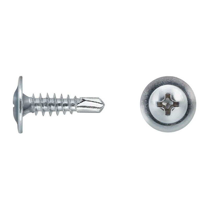 Саморезы по металлу с буром предназначены для крепления металлических листов толщиной до 2мм без предварительного сверления к металлическому основанию. Имеют полусферическую головку с прессшайбой и крестообразным шлицем PH2(Philips N2), резьбу с мелким шагом и наконечник со сверлом. Пресс-шайба плотно прижимает листовой материал к основанию, придавая всему соединению прочность и надежность. Производятся из оцинкованной стали. Саморезы имеют полную резьбу. При монтаже происходит сверление перед вкручиванием, что значительно упрощает монтаж.
