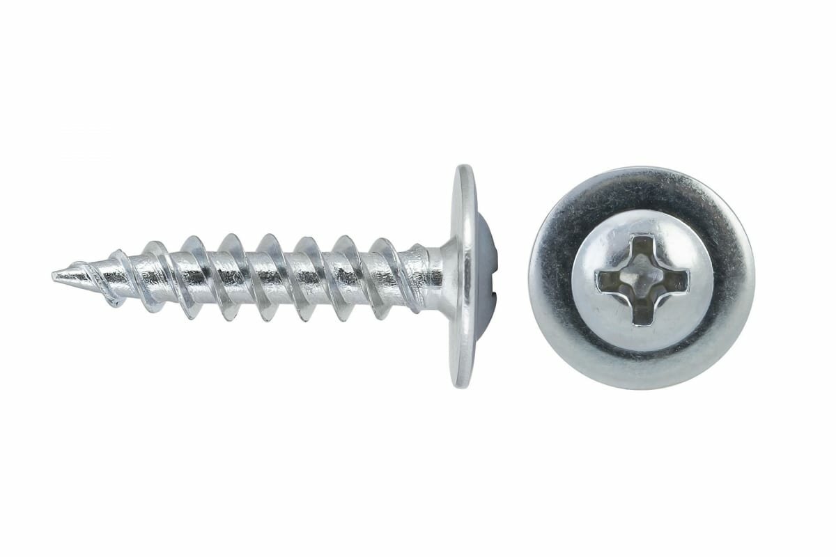 Саморез используется для крепления листов металла толщиной до 0,9 мм без предварительного сверления. Имеет галетную головку с пресс-шайбой, крестообразный шлиц Phillips №2, острый наконечник.
