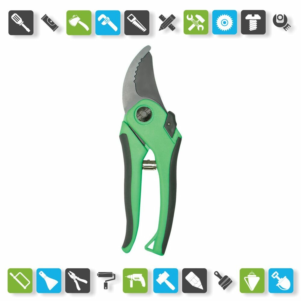 Секатор изготовлен из высококачественных материалов, служит для обрезания сучков и побегов деревьев и кустарников. Эргономичные рукоятки обеспечивают комфортную работу инструментом. На одной из рукоятей имеется отверстие для хранения секатора в подвешенном положении. Тефлоновое покрытие препятствует налипанию листьев и грязи.