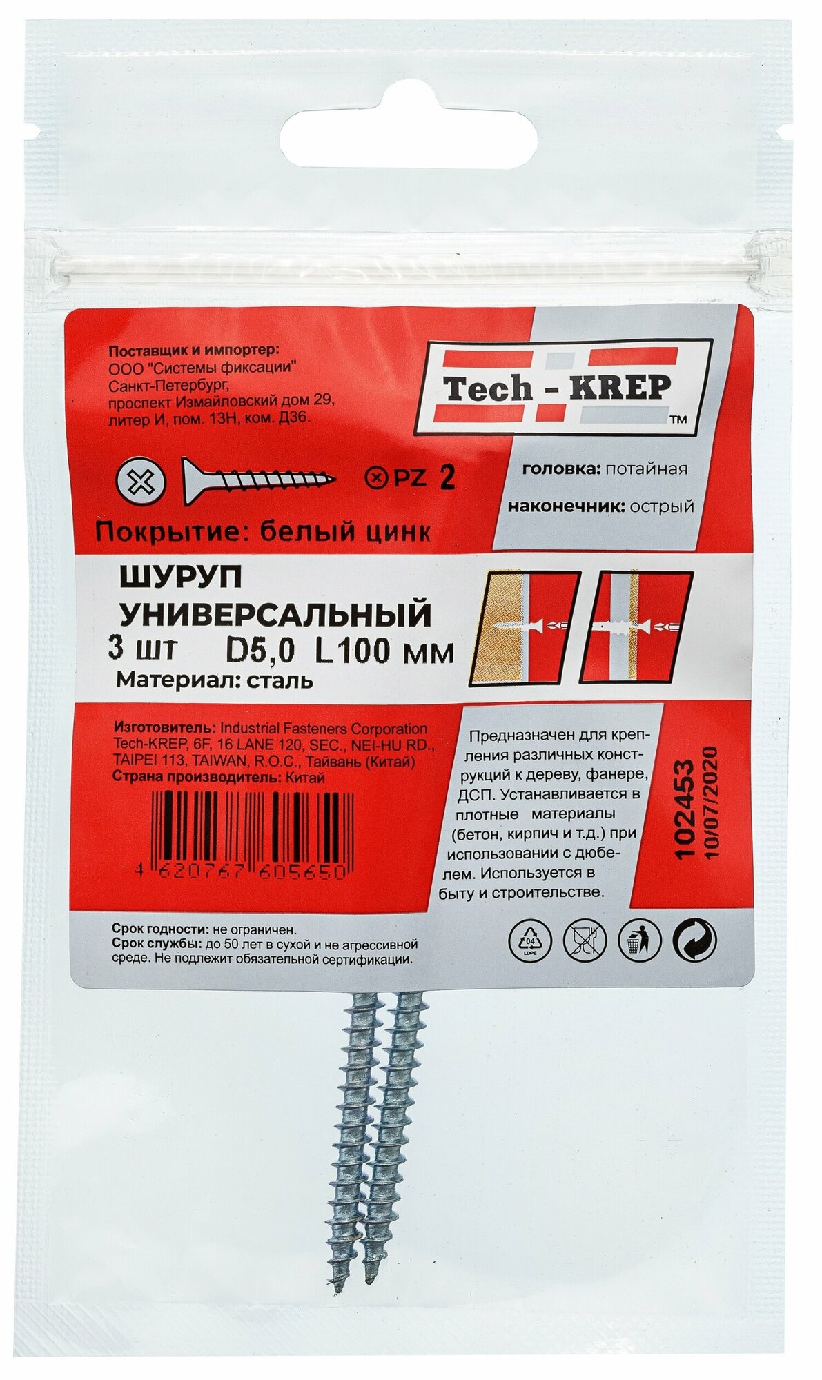 Саморез Tech-Krep ШУц 5,0х100 потайная головка 3 шт, пакет 102453 изготовлен из углеродистой стали с антикоррозионным цинковым покрытием, имеет потайную головку с крестообразным шлицем PZ, крупную накатанную резьбу и острый наконечник.Применяется для крепления дерева, любых видов древесных плит, листового металла небольшой толщины, гипсокартона и прочих листовых материалов с прочной фиксацией к любым поверхностям с использованием пластиковых дюбелей.