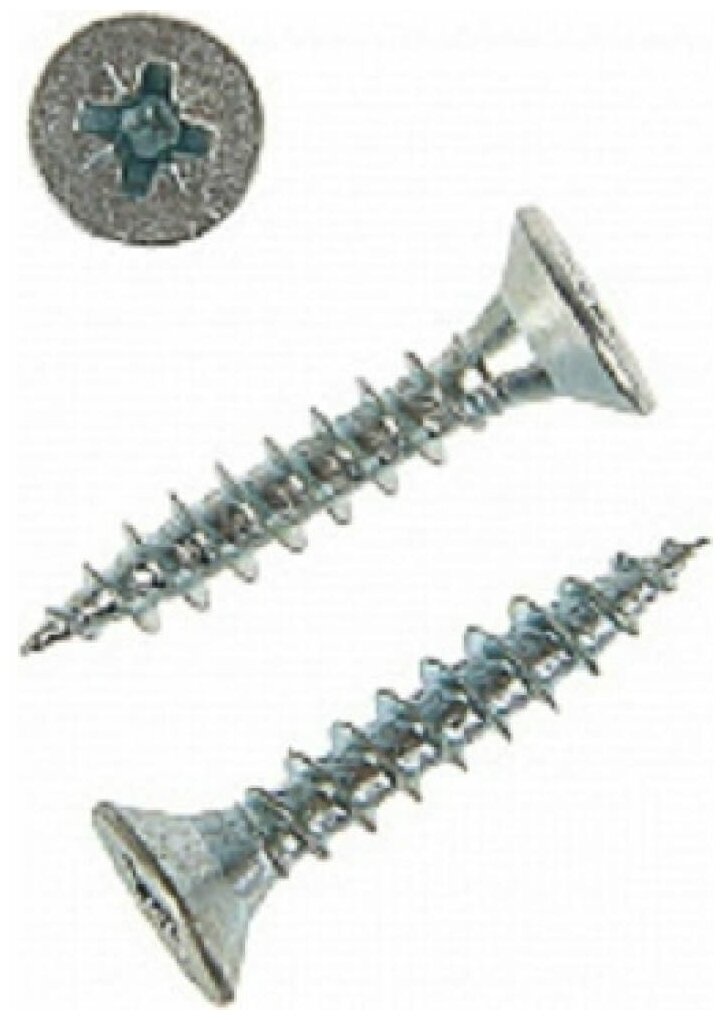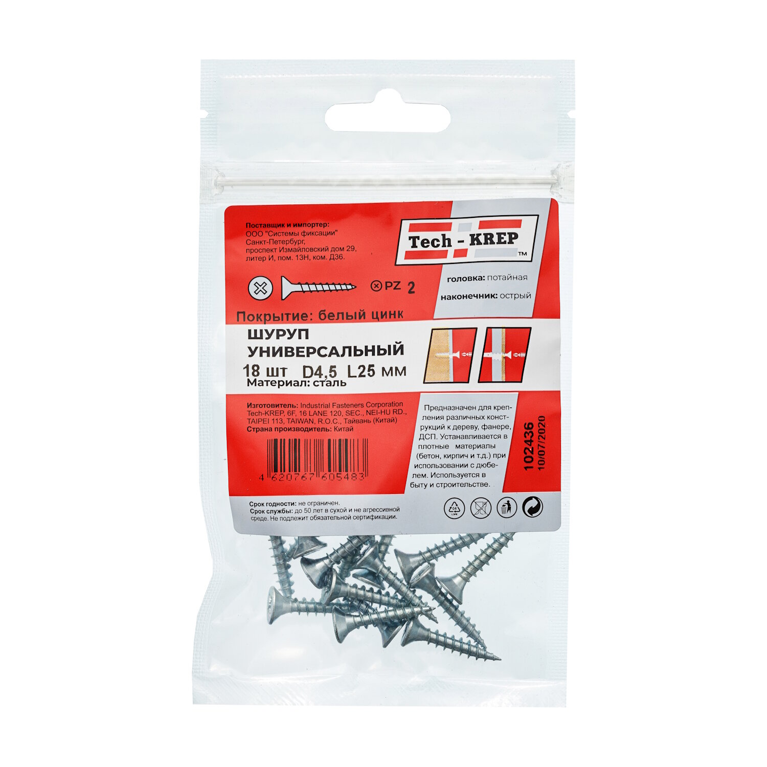 Саморез Tech-Krep ШУц 4,5х25 потайная головка 18 шт, пакет 102436 изготовлен из углеродистой стали с антикоррозионным цинковым покрытием, имеет потайную головку с крестообразным шлицем PZ, крупную накатанную резьбу и острый наконечник.Применяется для крепления дерева, любых видов древесных плит, листового металла небольшой толщины, гипсокартона и прочих листовых материалов с прочной фиксацией к любым поверхностям с использованием пластиковых дюбелей.