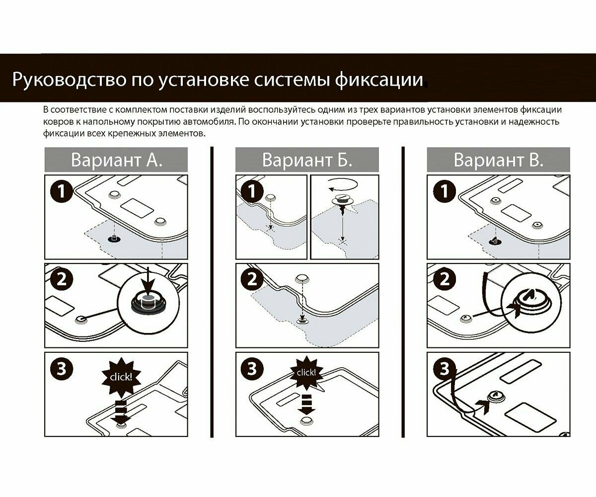 - Надежная система крепления, позволяющая закрепить коврик на штатные элементы фиксации, в результате чего отсутствует эффект скольжения по салону автомобиля.