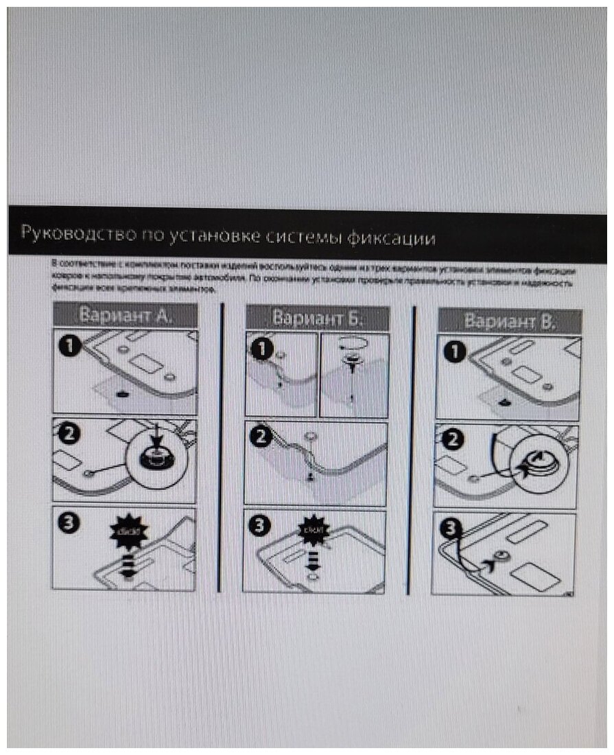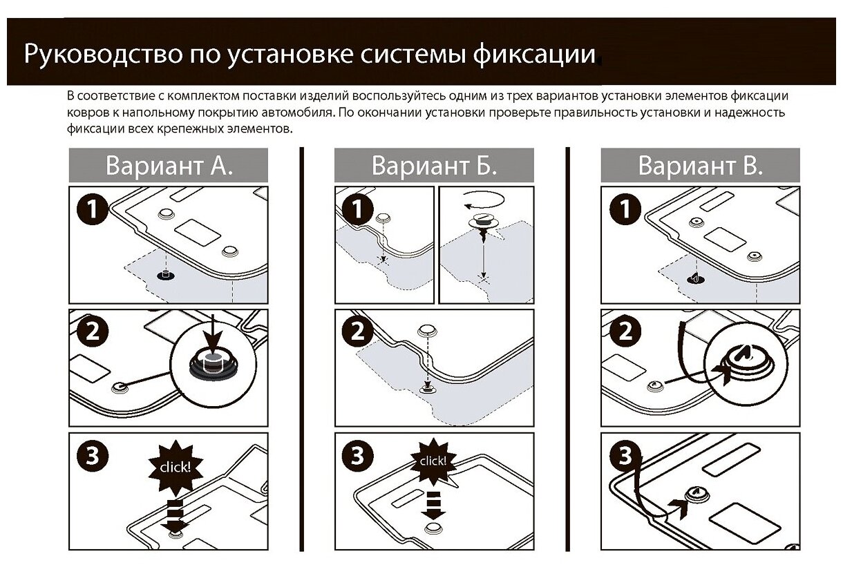 - Надежная система крепления, позволяющая закрепить коврик на штатные элементы фиксации, в результате чего отсутствует эффект скольжения по салону автомобиля.