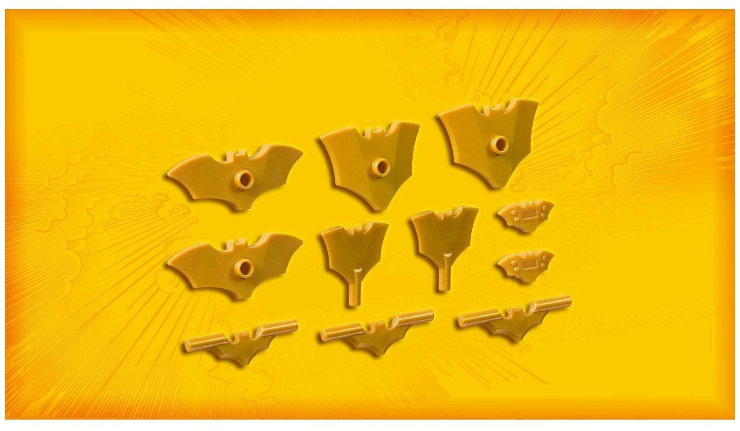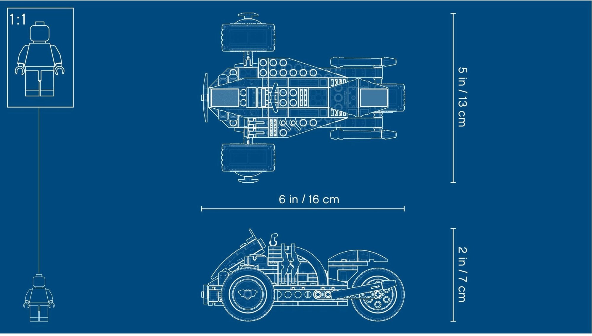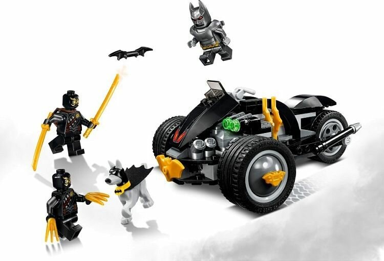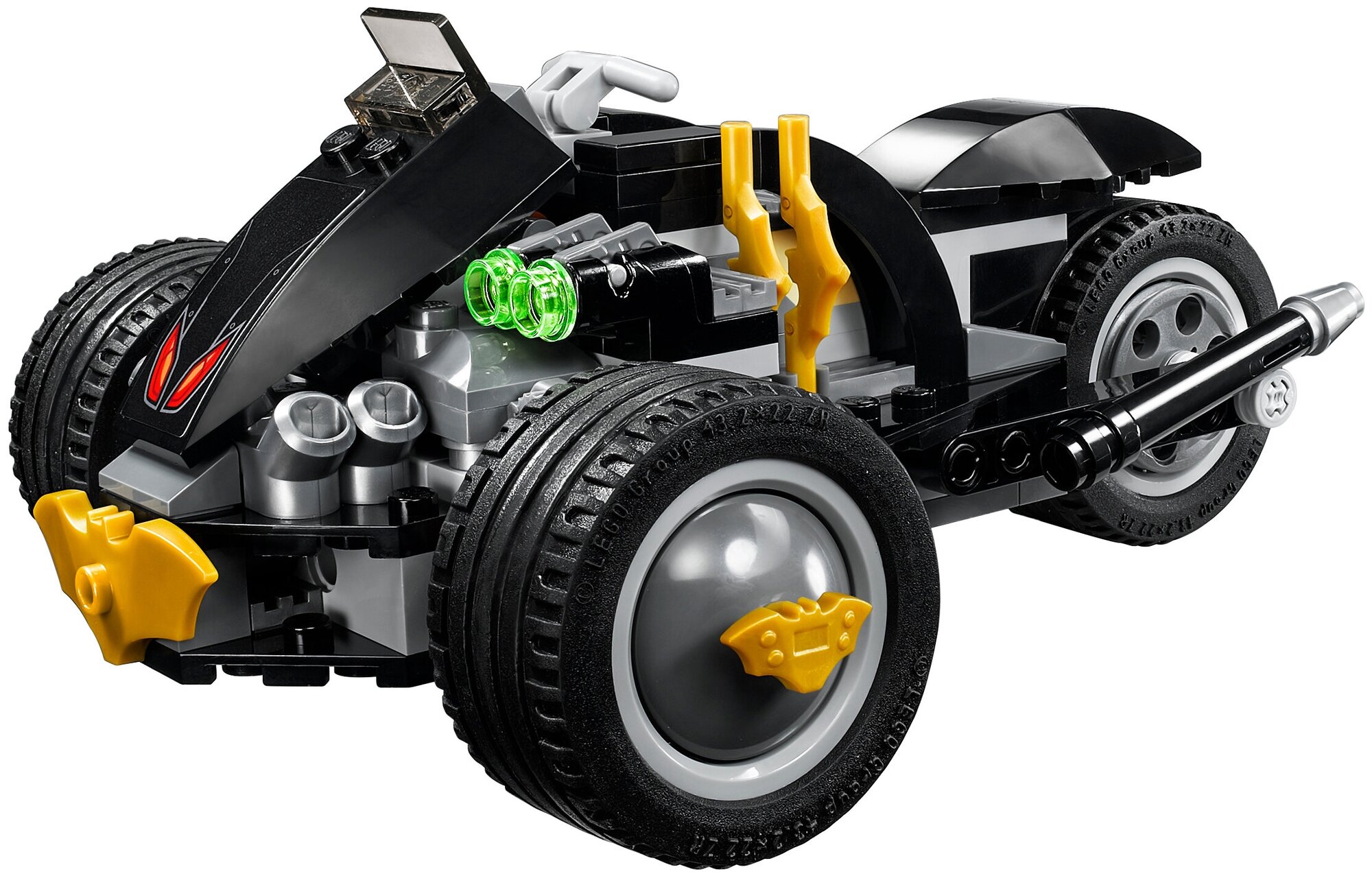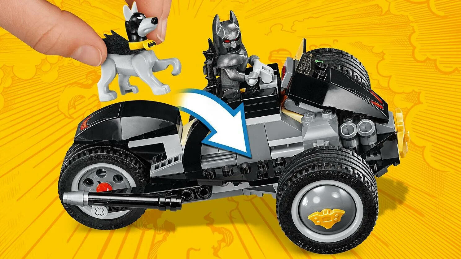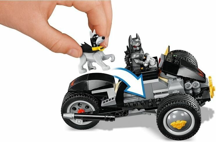 Из деталей набора вы сможете собрать трёхколёсный байк Бэтмена. Он выполнен в черном цвете с добавлением серых и золотистых элементов. Колёса байка вращаются, а на место водителя можно установить минифигурку. Также на корпусе установлены стат-шутеры и подвижные выхлопные трубы.