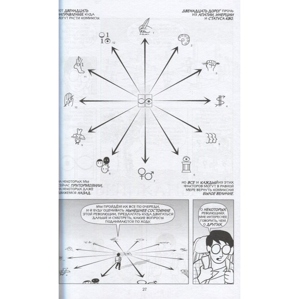 Достойное продолжение предыдущего "Понимание комикса" от того же автора. Превосходное описание, мысли и подача. Скотт Макклауд в данном комикс-учебнике выступает не сколько учителем или журналистом от мира комиксов, сколько пророком. Он размышляет уже о будущем и более того - успешно его предсказывает. Те мысли которые он озвучил, те вещи которые он прогнозировал на момент написания книги (а это 2000-ый год) сбылись в полной мере и даже с лихвой! Воистину интересная работа о внутренней "кухне" комиксов и комикс-индустрии. Читать интересно даже не смотря на некоторые "косяки" от издательства. Будет интерено широкому кругу читателей.