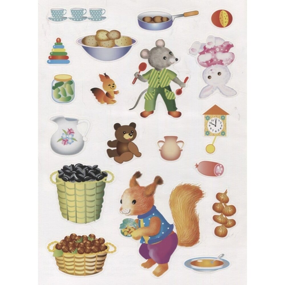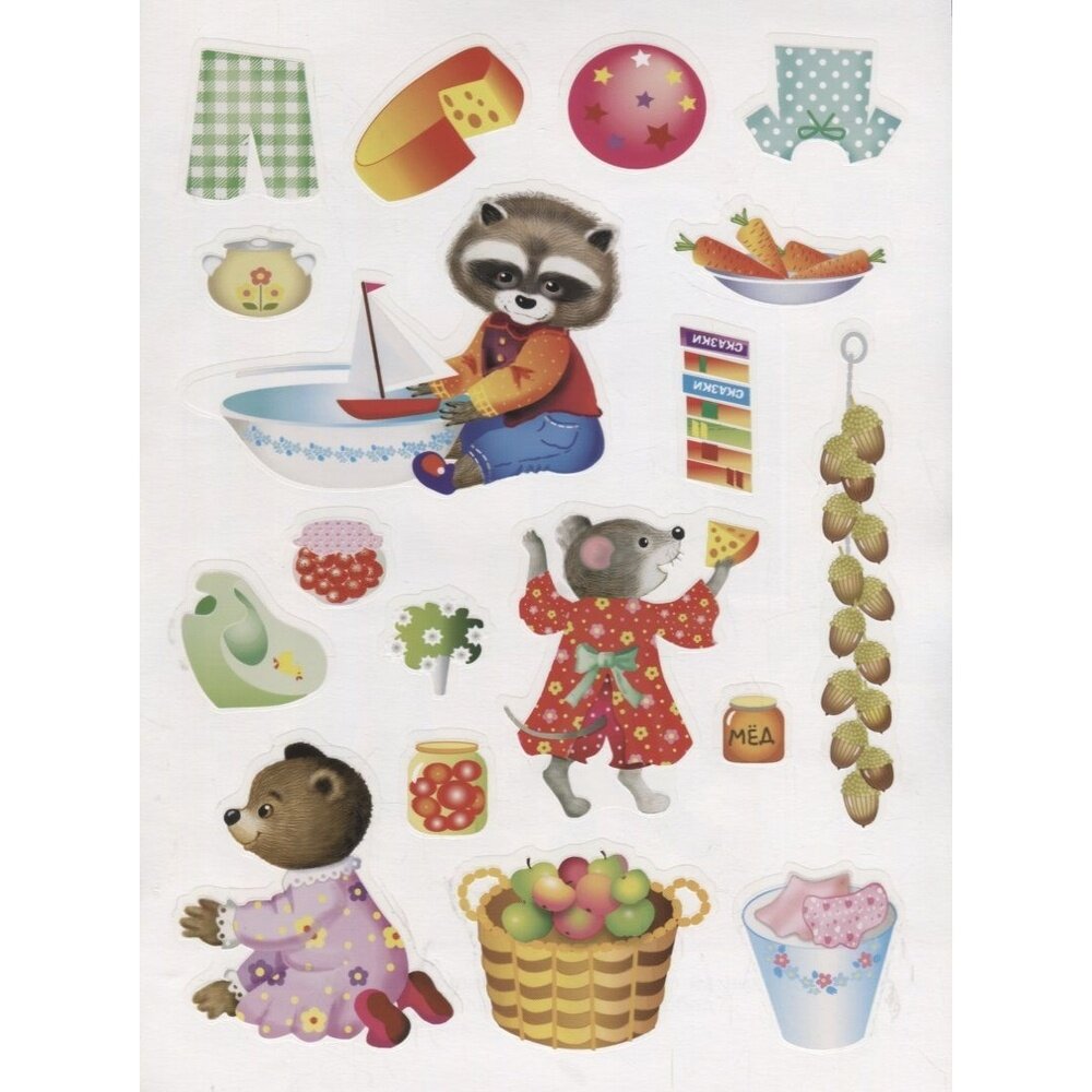Внутри книжки лист с наклейками, с их помощью можно дополнить каждую картинку деталями, предметами или персонажами - надо только проявить фантазию.