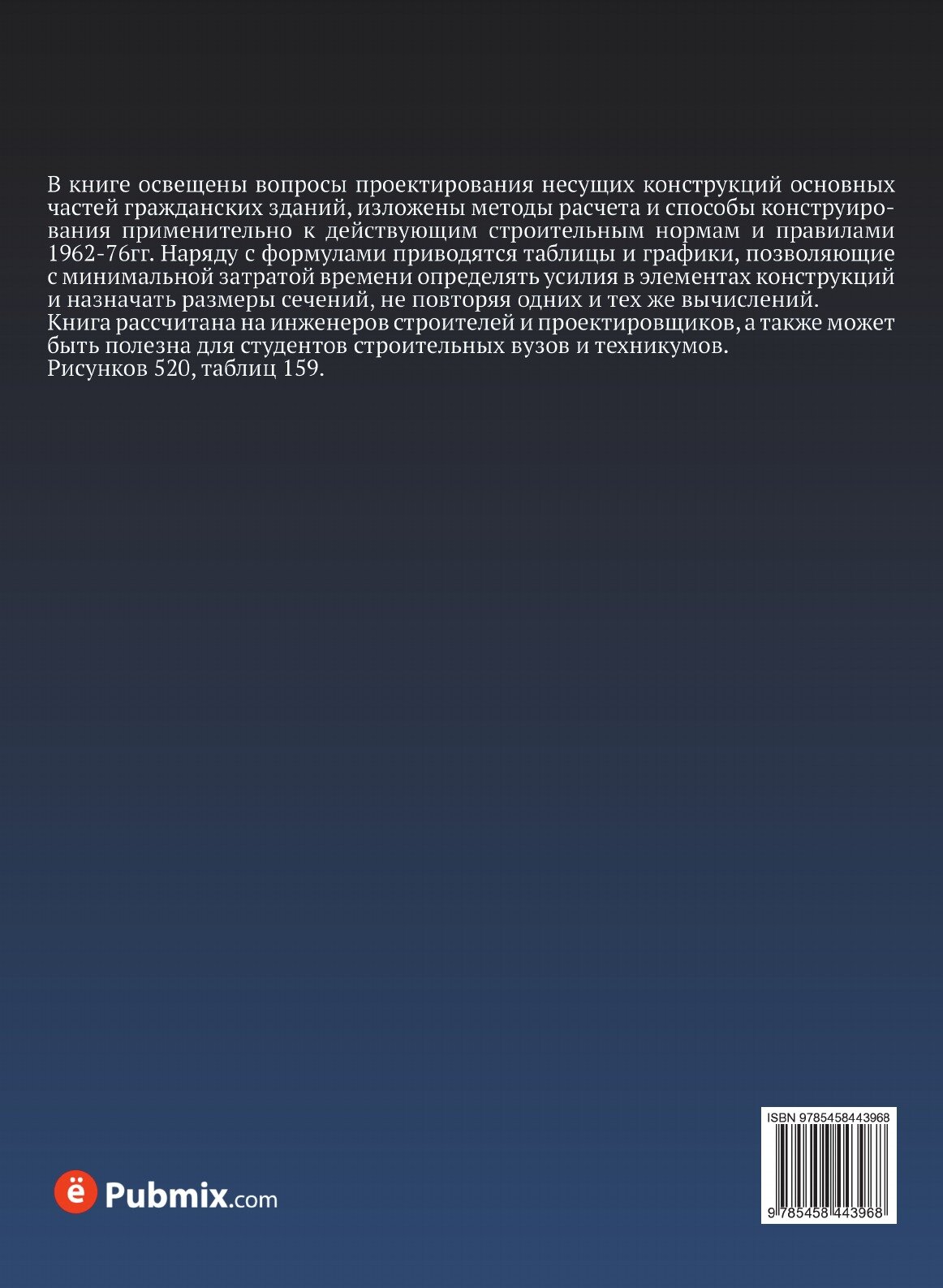 В книге освещены вопросы проектирования несущих конструкций основных частей гражданских зданий, изложены методы расчета и способы конструирования применительно к действующим строительным нормам и правилами 1962-76гг. Наряду с формулами приводятся таблицы и графики, позволяющие с минимальной затратой времени определять усилия в элементах конструкций и назначать размеры сечений, не повторяя одних и тех же вычислений. Книга рассчитана на инженеров строителей и проектировщиков, а также может быть полезна для студентов строительных вузов и техникумов. Рисунков 520, таблиц 159.