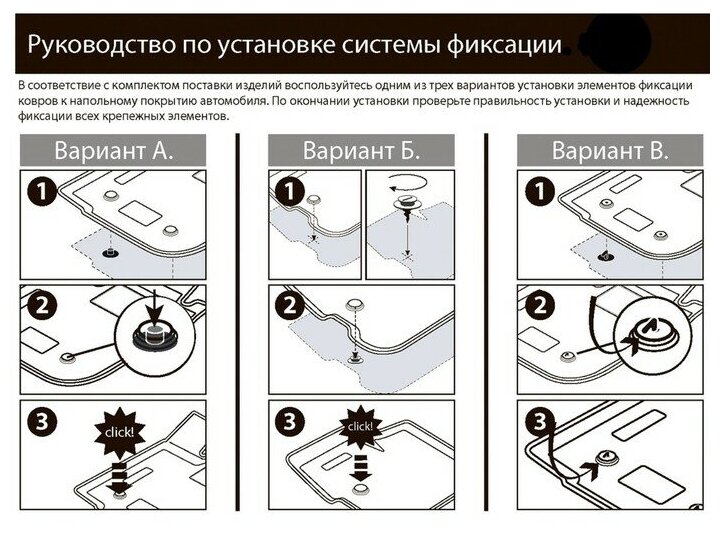 - Надежная система крепления, позволяющая закрепить коврик на штатные элементы фиксации, в результате чего отсутствует эффект скольжения по салону автомобиля.