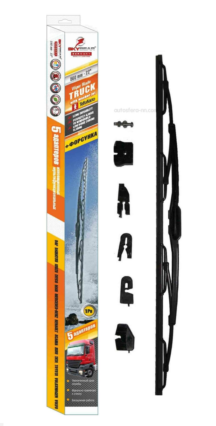 Щетка с/о 22"/56 см каркасная грузовая + форсунка 5 адаптеров. При разработке этой модели главным критерием были: повышенная надежность, долговечность и качество. Комплект из 5 адаптеров позволяет применение этой щетки на большинстве грузовых автомобилей и спецтехнике. Встроенная форсунка позволяет значительно сократить расход омывающей жидкости. Идеально прилегает к стеклу. Бесшумное скольжение. Увеличенный срок службы благодаря тефлоновому покрытию.