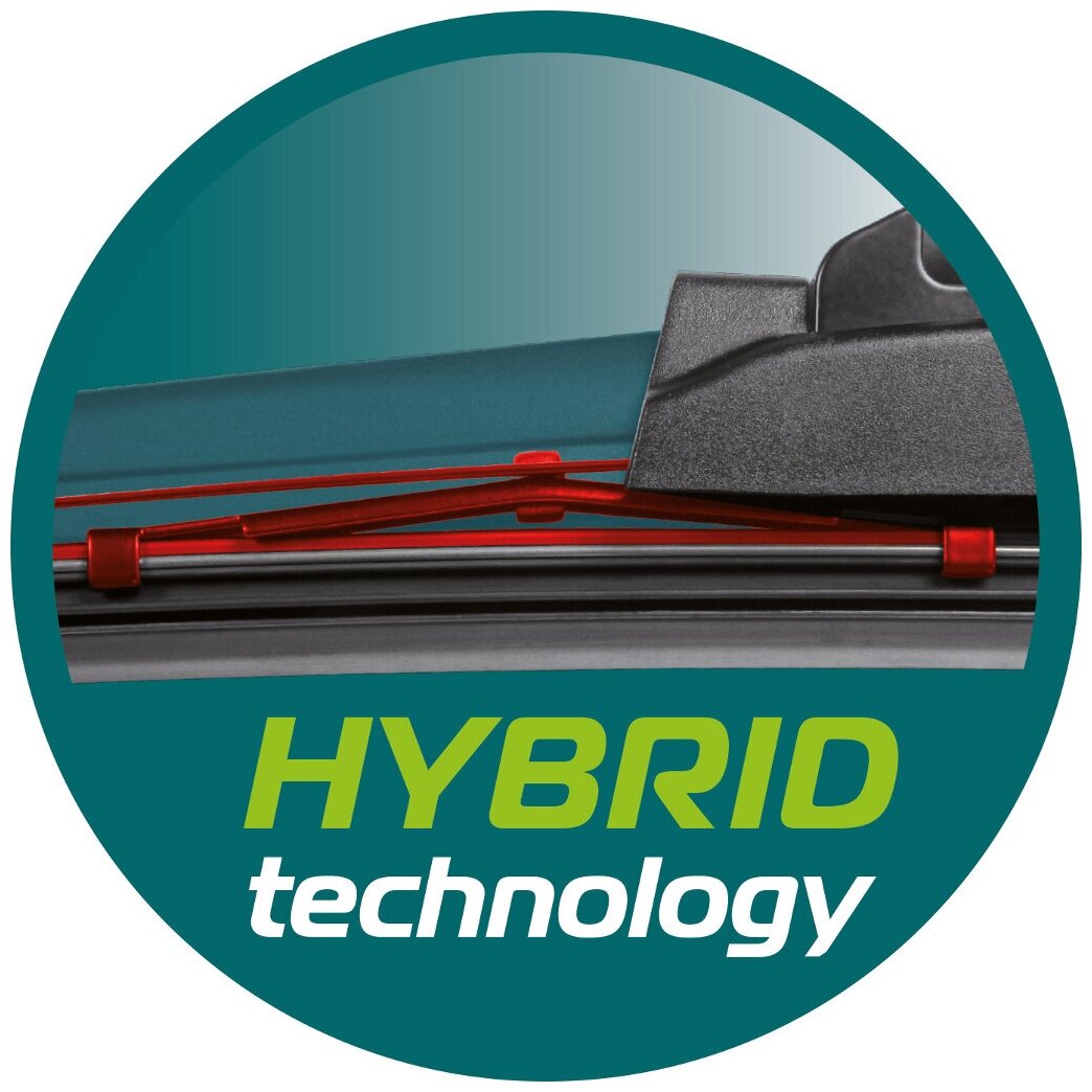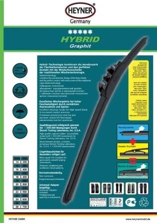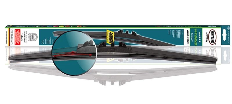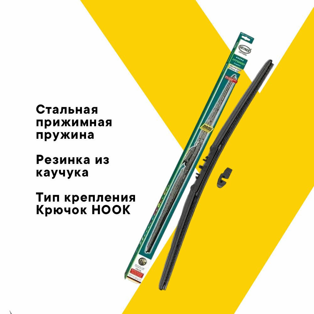 Щетка стеклоочистителя HEYNER. Современная гибридная технология объединяет аэродинамичный профиль бескаркасных щеток и идеальный контакт с лобовым стеклом классической каркасной щетки. Качественная резина из 100% натурального каучука.