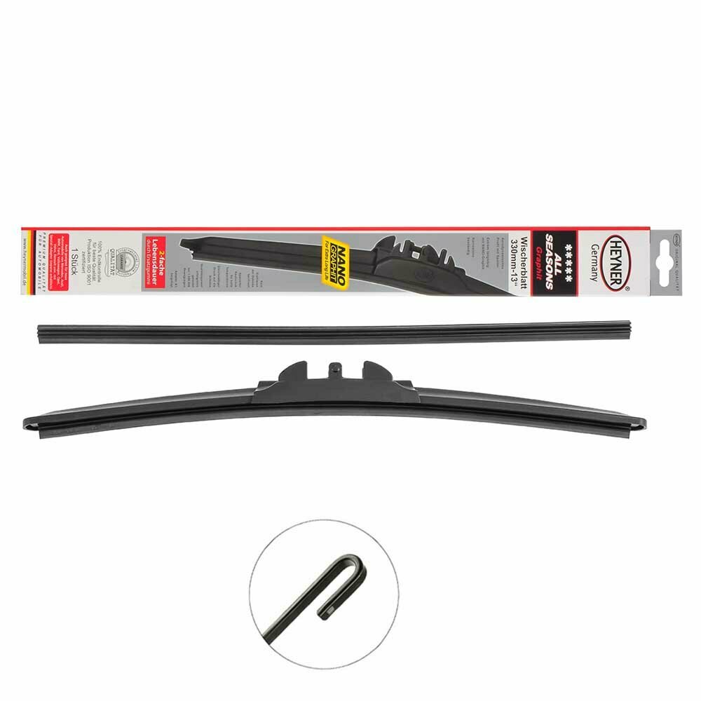 Всесезонная щетка успешно работает в условиях непогоды: стекло прозрачное и чистое даже в снег и дождь, а составные части не портятся под действиями солнца и мороза.Резиновое лезвие с нано-графитовым напылением чистит тихо и бережно.Двойная продолжительность жизни благодаря заменяемой резинке. Когда экстремальные условия повредят резинку, то замените только ее, но не щетку целиком.Спойлер обеспечивает прилегание и чистую работу на скорости выше 120 км/ч и крутых поворотах. Резинка щётки стеклоочистителя является более эластичной и прочной благодаря NANO покрытию.Успешная аккредитация о сроке службы конструкции и резины в Detroit testing laboratory Inc. USA и TUV Rheinland
