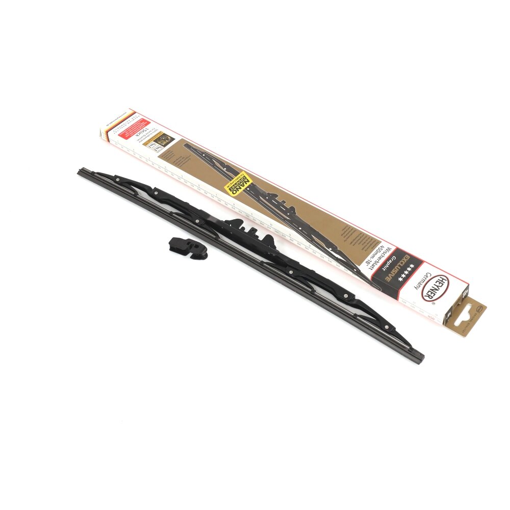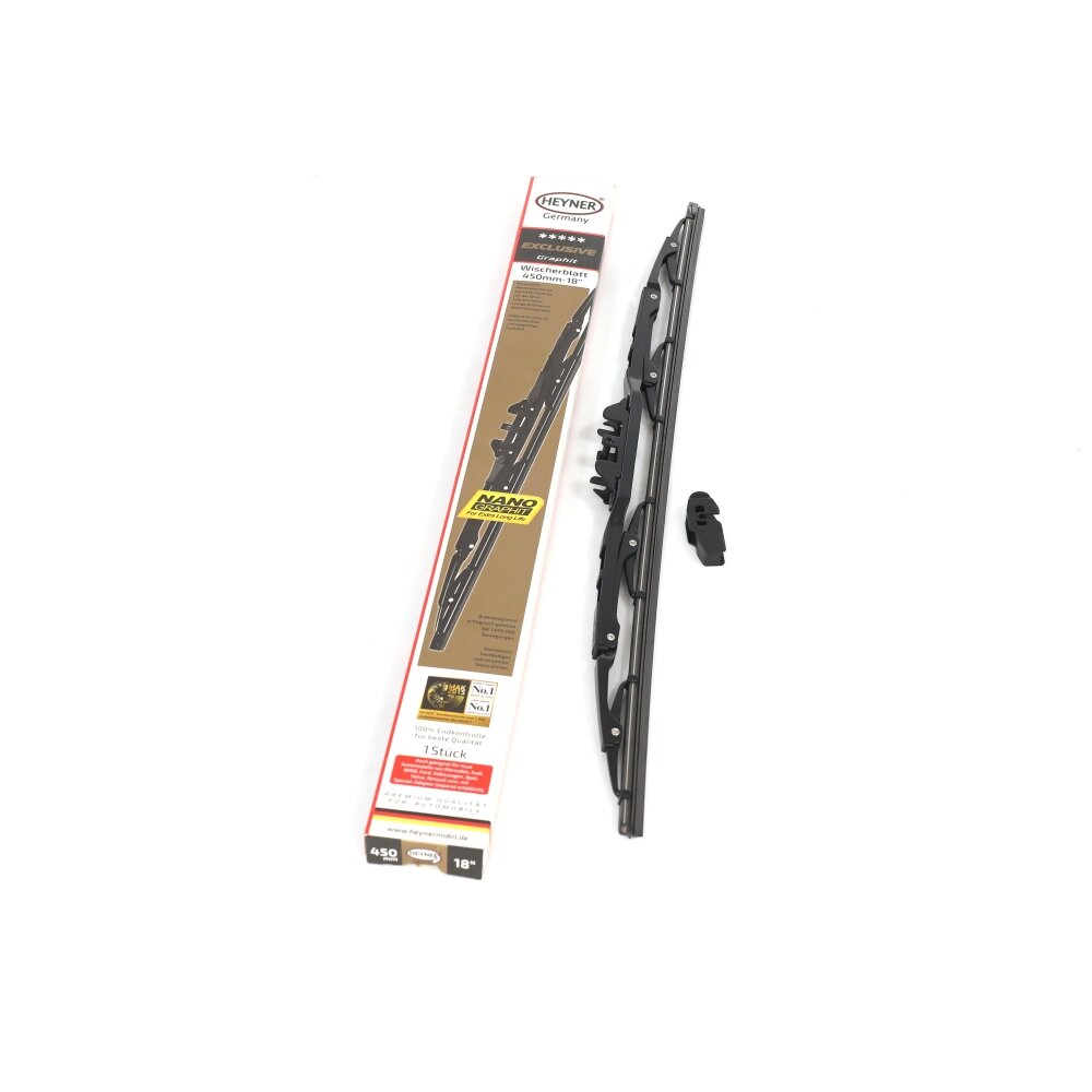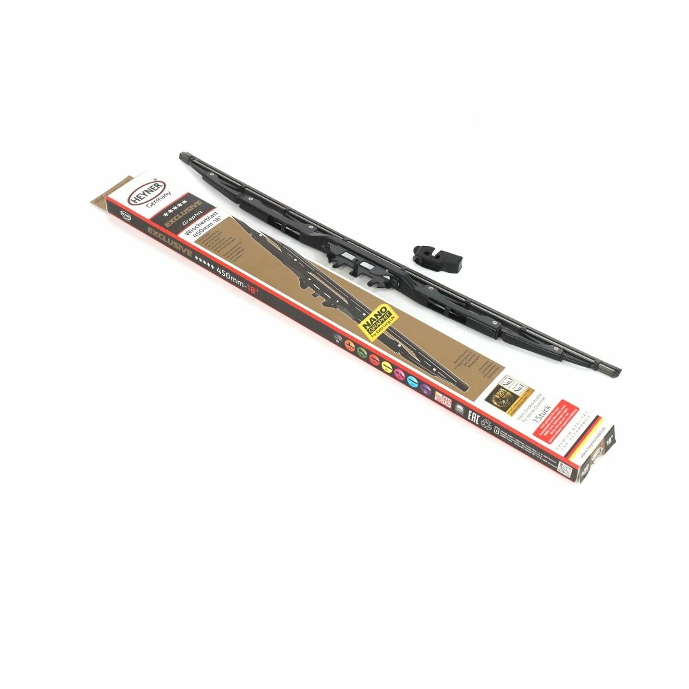 Щетка стеклоочистителя Heyner ExclusiVe имеет коррозийноустойчивый, полностью оцинкованной металлический каркас, имеет 8 точки прижима. Аэродинамический профиль для безопасной поездки также при ветре и высоких скоростях. Заклепки из высококачественной нержавеющей стали для долгллетней работы. Оригинальная качественная резина покрыта жидким графитом Liquid-Fix-Graphit для особенно долговременного использования. Успешно испытана Detroit Testing Laboratory, Inc. U.S.A. с 1.800.000 движениями. Включены адаптеры для щеток с креплением крючок, включён в упаковку. 100% контроль качества обеспечивает надёжную работу щёток во все времена года. Щетка может использоваться с специальными адаптерами ALCA® (продаётся отдельно).