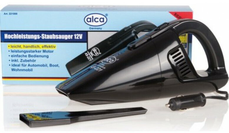 Автопылесос Alca 12V 60W, кабель 4 м с моющимся фильтром. Объем пылесборника 400 мл. Служит для сбора сухого мусора и пыли в автомобильных салонах. Подключается к прикуривателю автомобиля. Модель имеет компактные размеры, благодаря чему удобна для работы в местах с ограниченным доступом. Кабель длиной 4 метра позволяет осуществлять уборку на значительном расстоянии от точки подключения. Пластиковый корпус обладает повышенной прочностью и небольшим весом. Материал корпуса: ABC пластик. В комплект входит насадка для труднодоступных мест.Давление всасывания: 14 mmHg. Уровень шума 74 dB. Вес 600 гр.Цвет: черный.