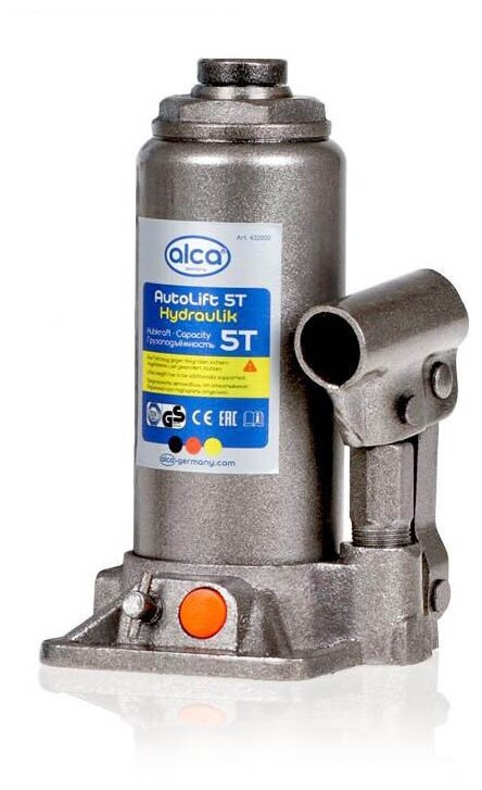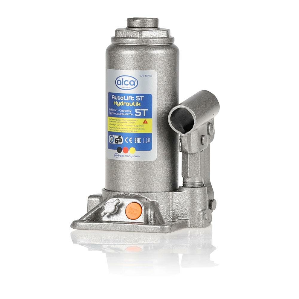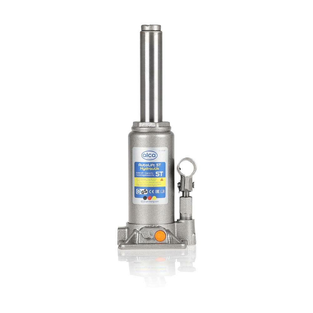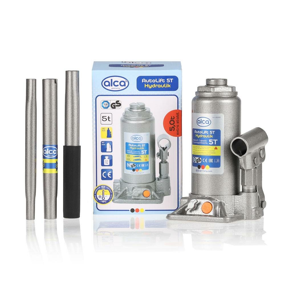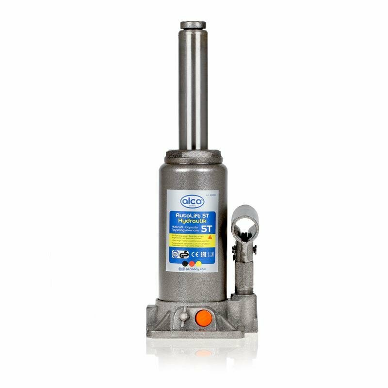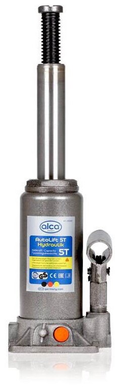 Аксессуары Alca Гидравлический бутылочный домкрат Alca предназначен для работы с грузами массой до 5 тонн. Он имеет продуманную надежную конструкцию и очень удобен в обращении. Минимальная высота подхвата домкрата 197 мм, а максимальная высота подъема 382 мм. Alca можно использовать в качестве подъемного механизма при обслуживании легковых автомобилей с увеличенной массой и легких грузовиков, а также для строительных и такелажных работ.