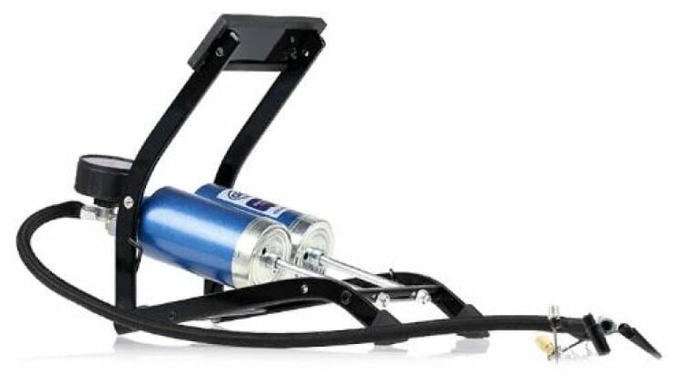 | Прочие особенности | Насос ножной компактный два цилиндра, 7 бар, с манометром. Манометр с регулируемой красной отметкой. Шланг 60 см., 4 адаптера для накачки шин автомобилей, мячей, велосипедов и т.д.. Изготовлен из высококачественной стали. |