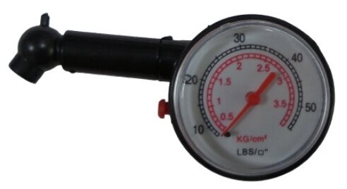 Манометр шинный стрелочный в блистере. Изготовлен из ударопрочной пластмассы. Диапазон измерения давления 10-50 PSI/ 0,5-3,5 кг/кв.см. Шаг измерения 1 PSI/ 0,1 кг/кв.см. Кнопка для сброса показаний давления. Игла для сброса лишнего давления.