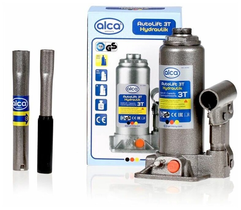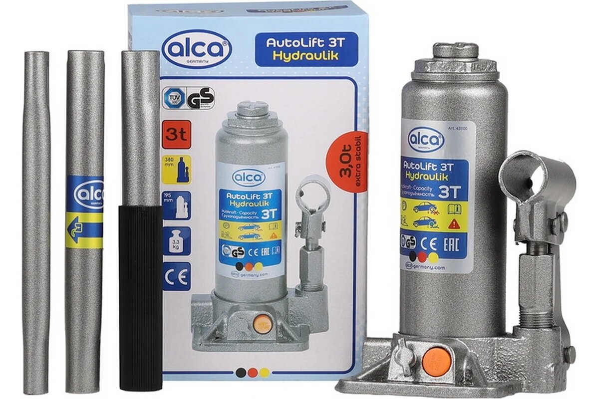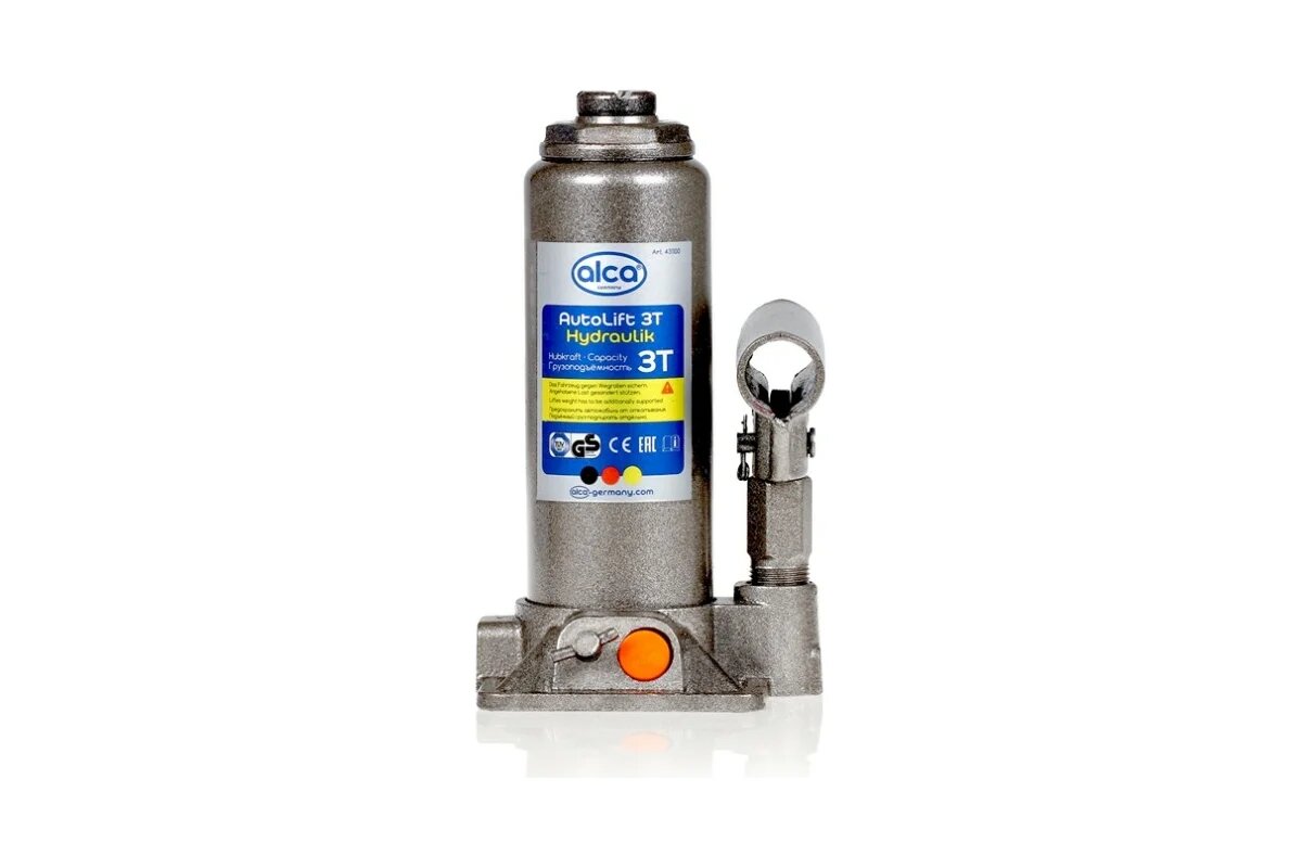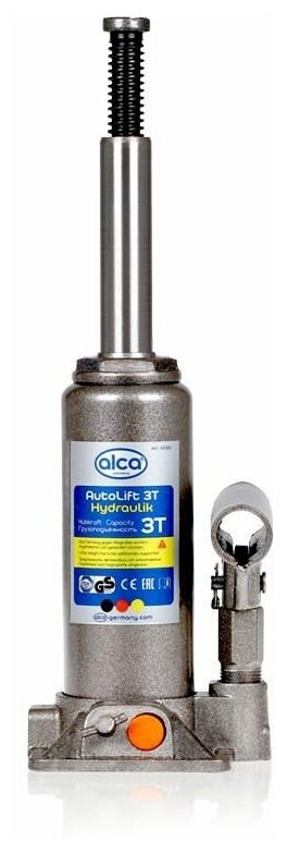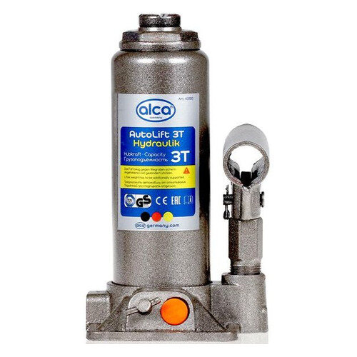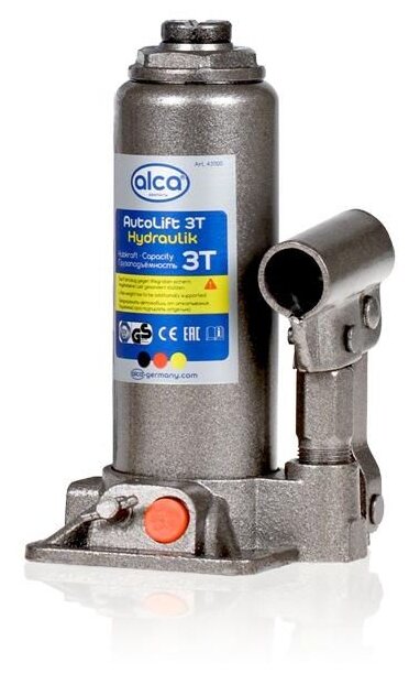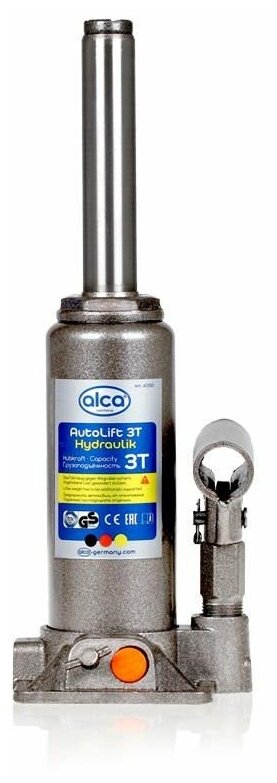 Аксессуары Alca Гидравлический бутылочный домкрат Alca предназначен для работы с грузами массой до 3 тонн. Он имеет продуманную конструкцию и очень удобен в обращении. Минимальная высота подхвата домкрата 195 мм, а максимальная высота подъема 380 мм. Alca можно использовать в качестве подъемного механизма при обслуживания легковых автомобилей, а также для строительных и такелажных работ.